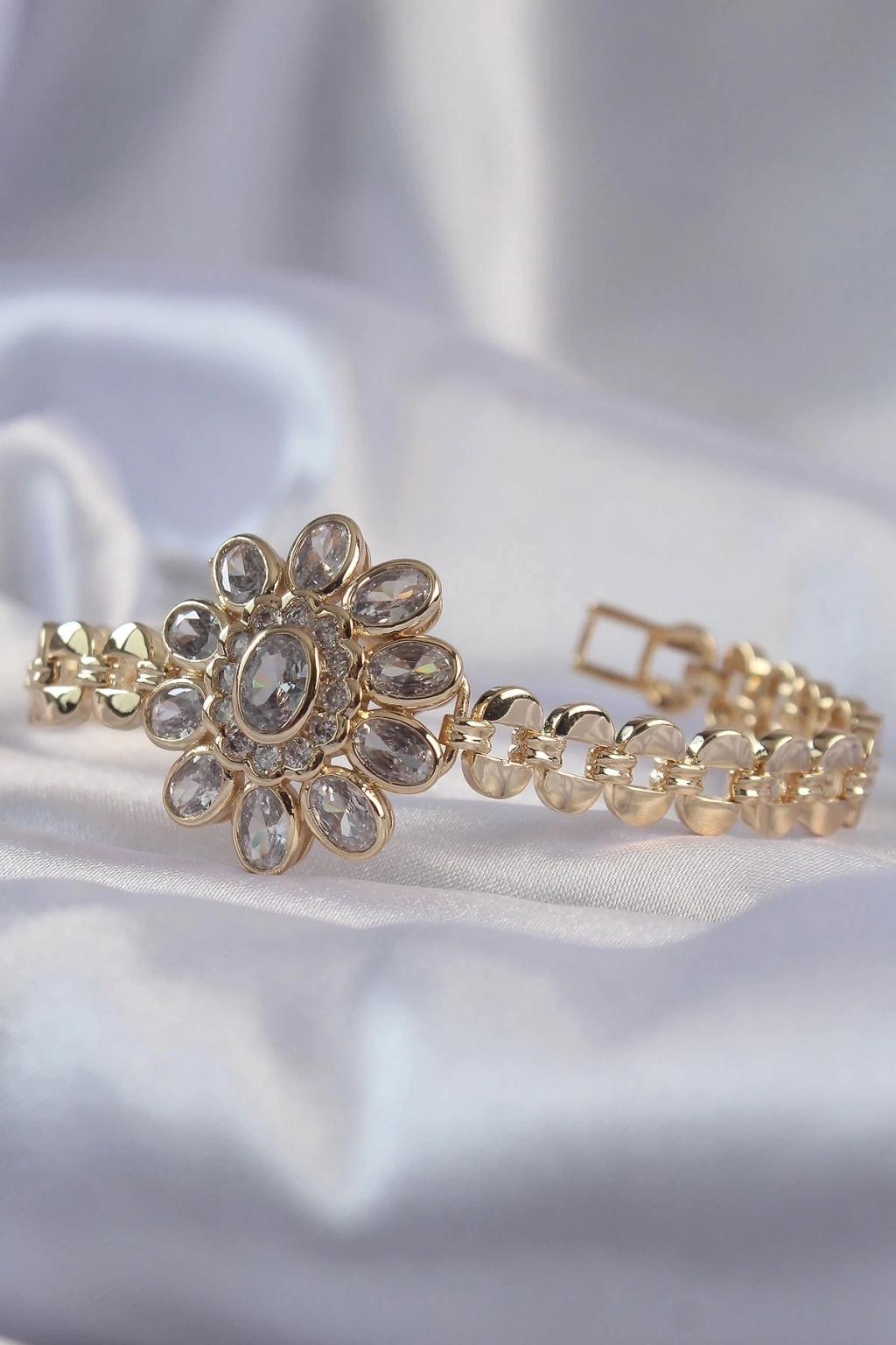 • Pirinç Gold Renk İri Zirkon Taşlı Çiçek Figürlü Bileklik