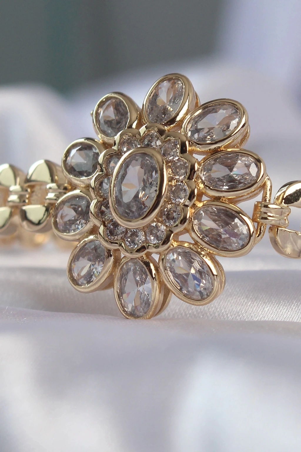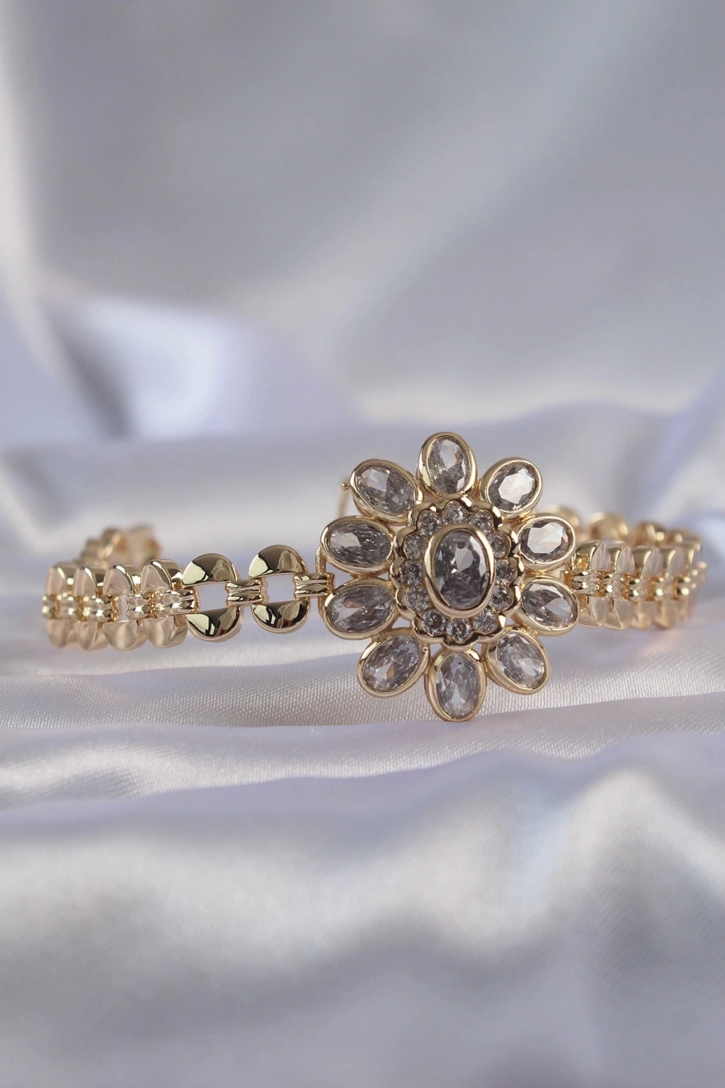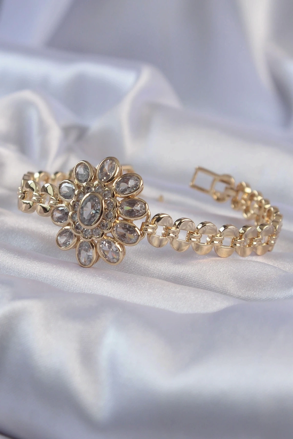 Pirinç Gold Renk İri Zirkon Taşlı Çiçek Figürlü Bileklik