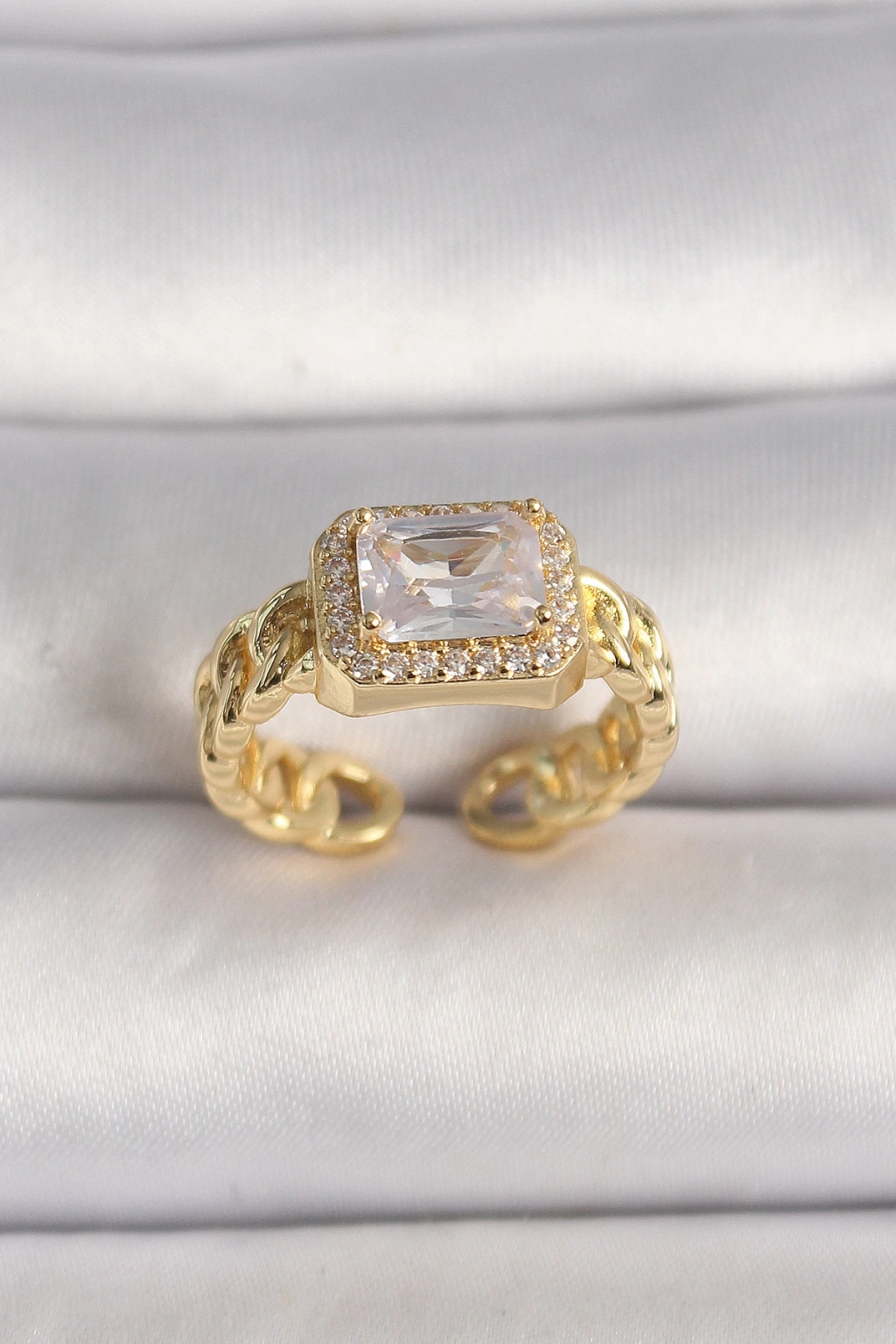 Pirinç Gold Renk Zincir Model Kare Zirkon Taşlı Kadın Yüzük
