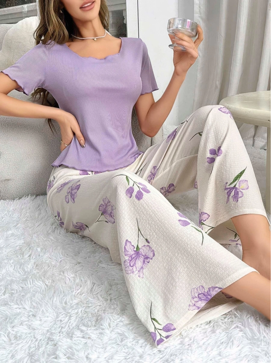 Kadın Mor Çiçek Desenli Yumuşak Pamuklu Uzun Pijama Takımı 5133
