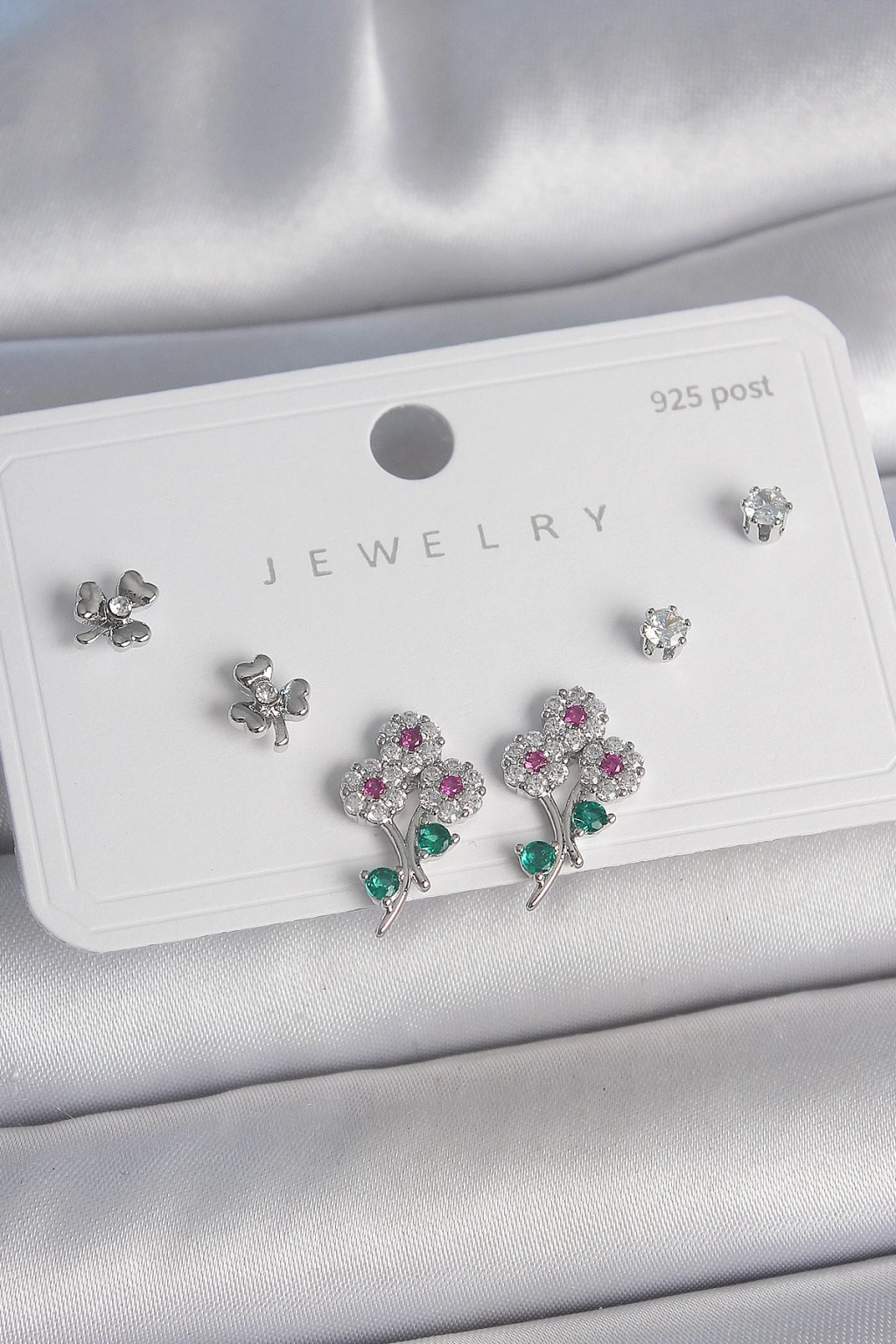 Pirinç Gümüş Renk Renkli Zirkon Taşlı Çiçek Model Yaprak Detay 925 Ayar Gümüş Çivi Kadın Küpe Seti