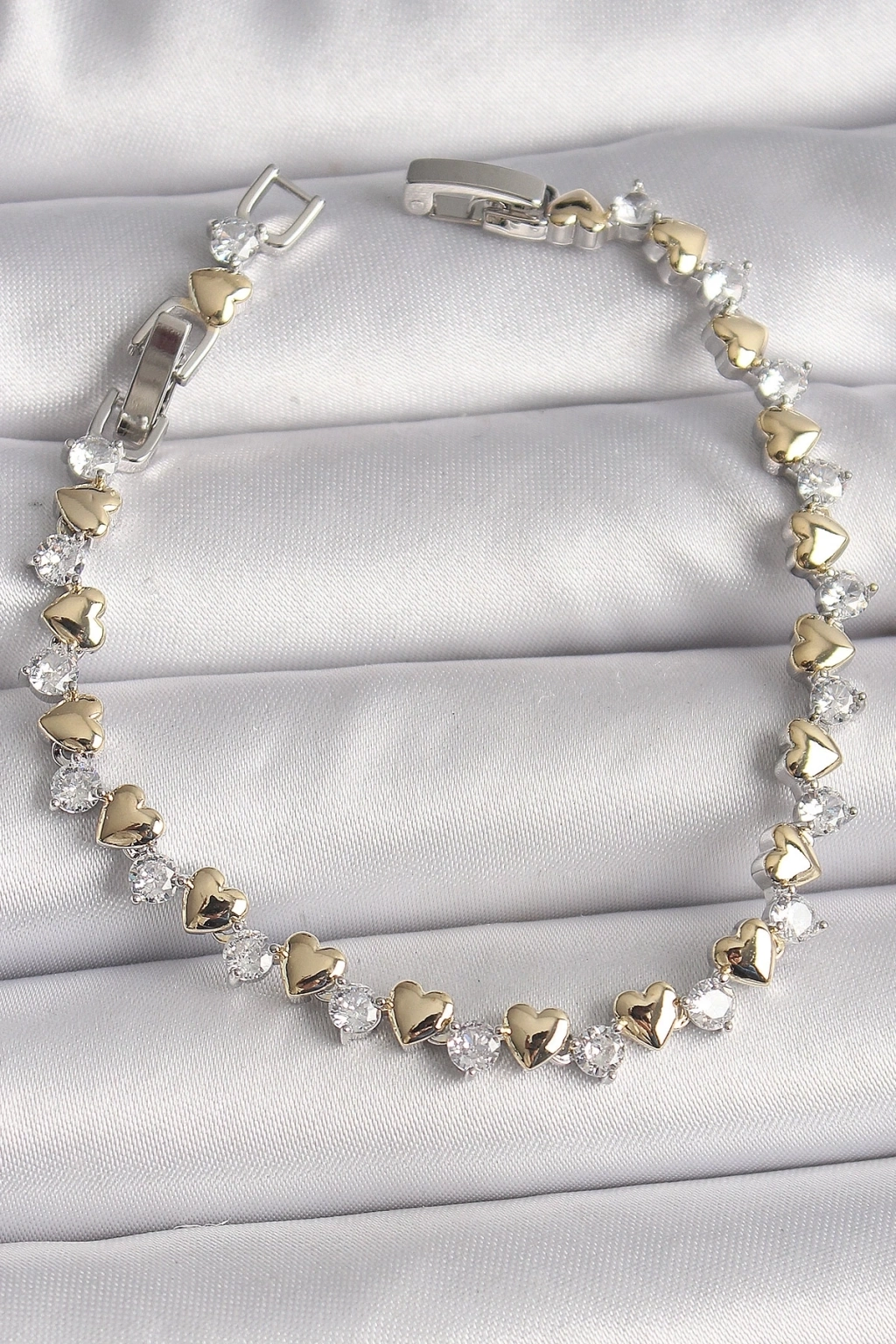 Pirinç Gümüş Renk Zirkon Taşlı Gold Kalpli VIP Seri Kadın Bileklik