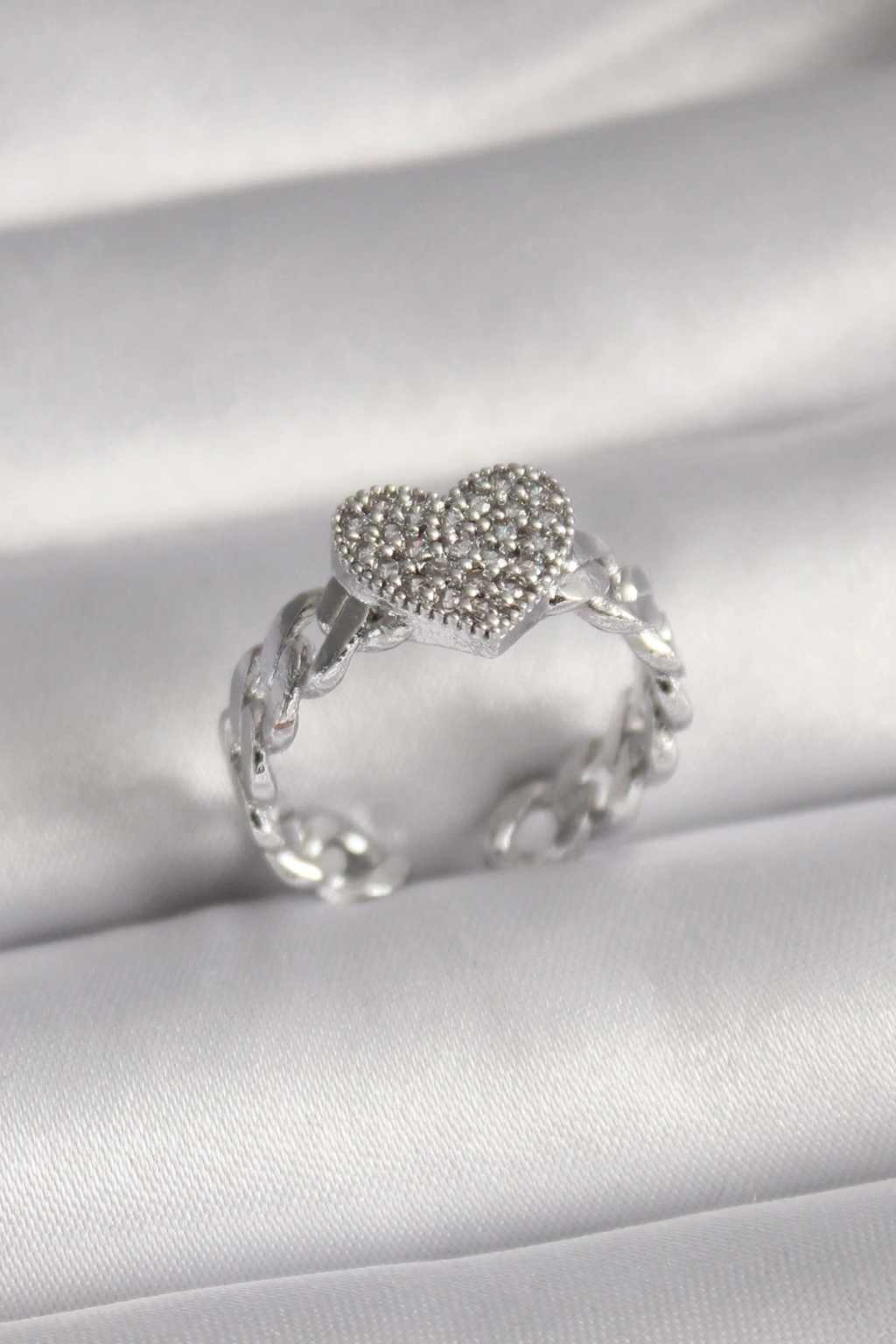 Pirinç Gümüş Renk Zirkon Taşlı Kalp Model Kadın Yüzük