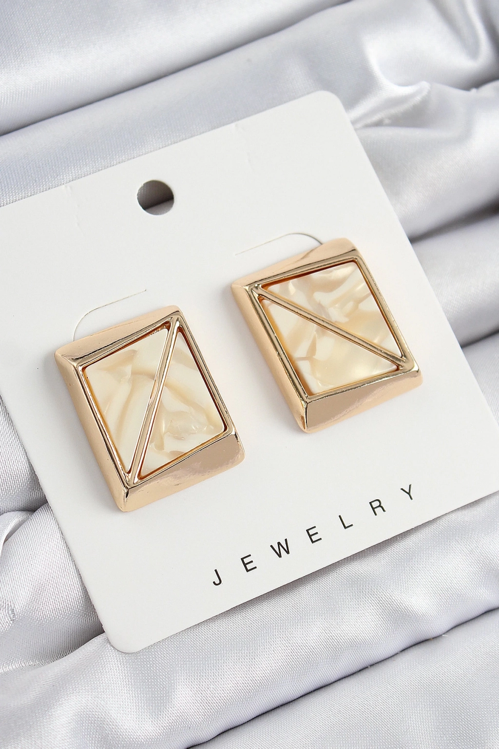 Pirinç Krem Üçgen Kesim Detaylı Kare Model Vintage Gold Renk Kadın Küpe