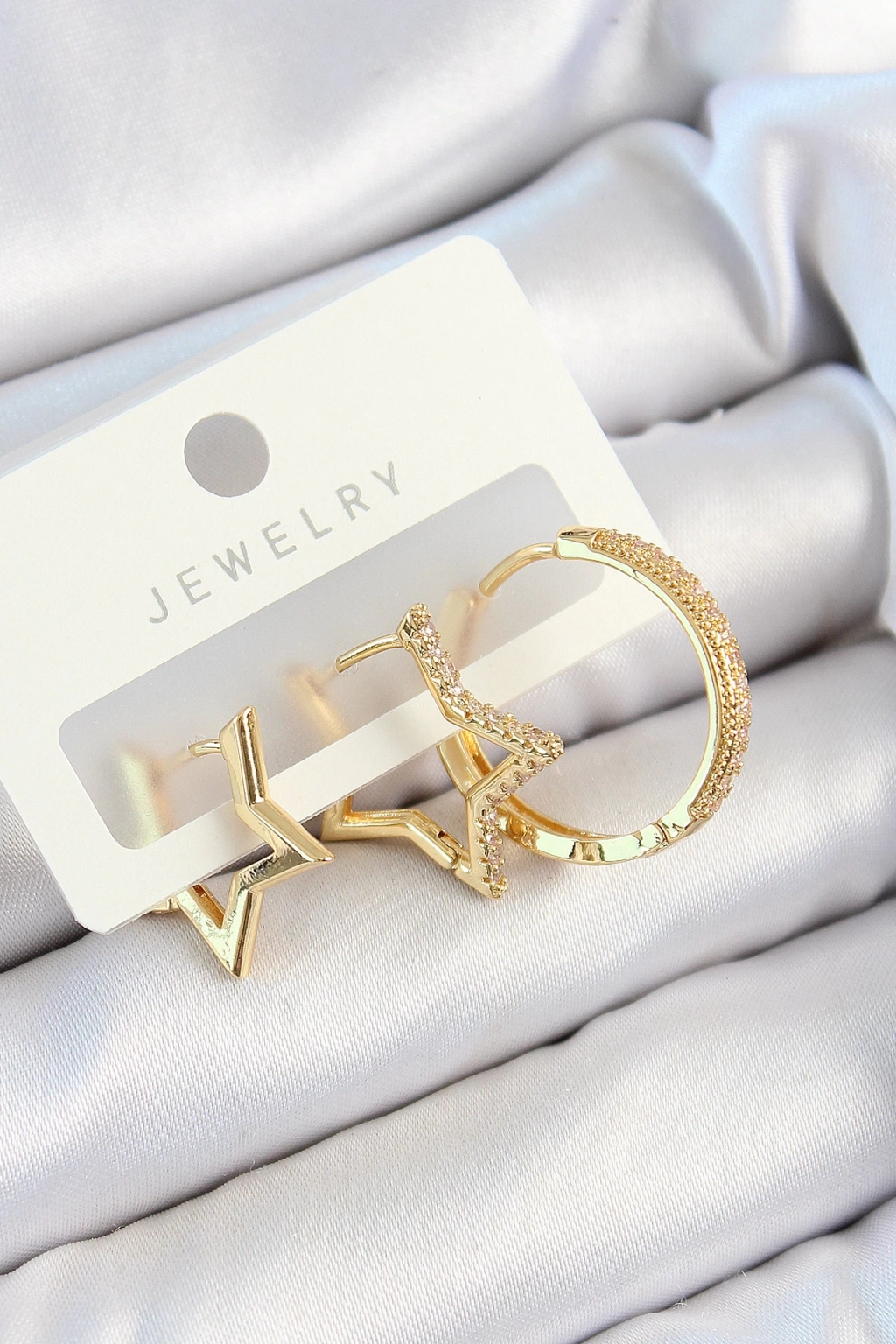 Pirinç Zirkon Taşlı Yıldız Ve Halka Model Gold Renk 3'lü Çift Kadın Küpe Set