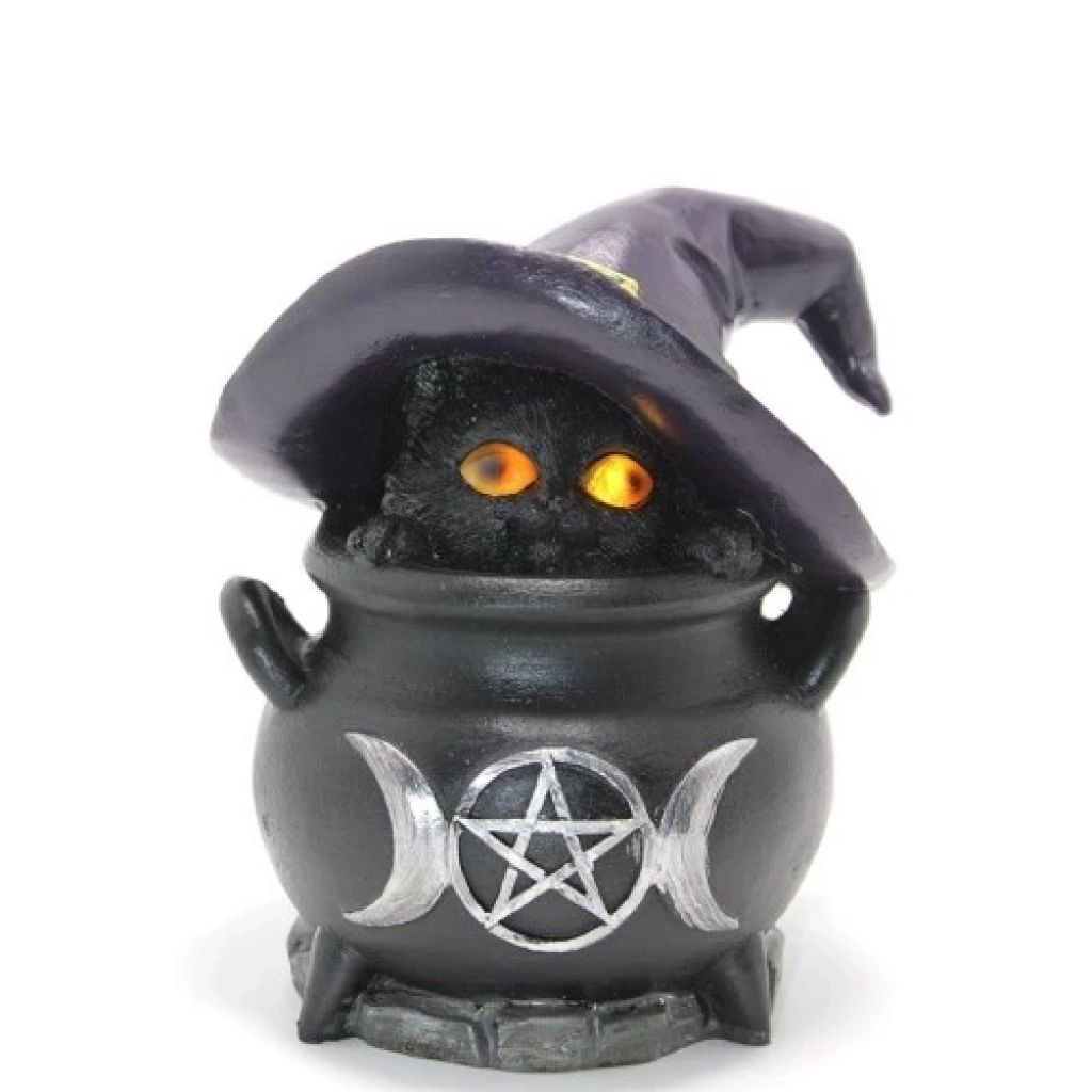POLYESTER KEDİ LEDLİÜrün ÖzellikleriPolyester Kedi Ledli, mistik ve gotik dekorasyonlardan hoşlananlar için tasarlanmış özel bir figürdür. Kazan içindeki şapkalı kara kedi detayı, ürüne büyüleyici bir hava katarken, gözlerindeki LED ışıklar karanlıkta etkileyici bir görünüm sunar. Dayanıklı polyester malzemeden üretilmiş olup, uzun ömürlü bir kullanım sağlar. Pentagram ve ay sembolleriyle süslenmiş kazan tasarımı, cadı temalı dekorasyonları tamamlayan harika bir parçadır. Ev, ofis ya da koleksiyon amaçlı tercih edilebilir.Paket İçeriği1 Adet Polyester Kedi Ledli