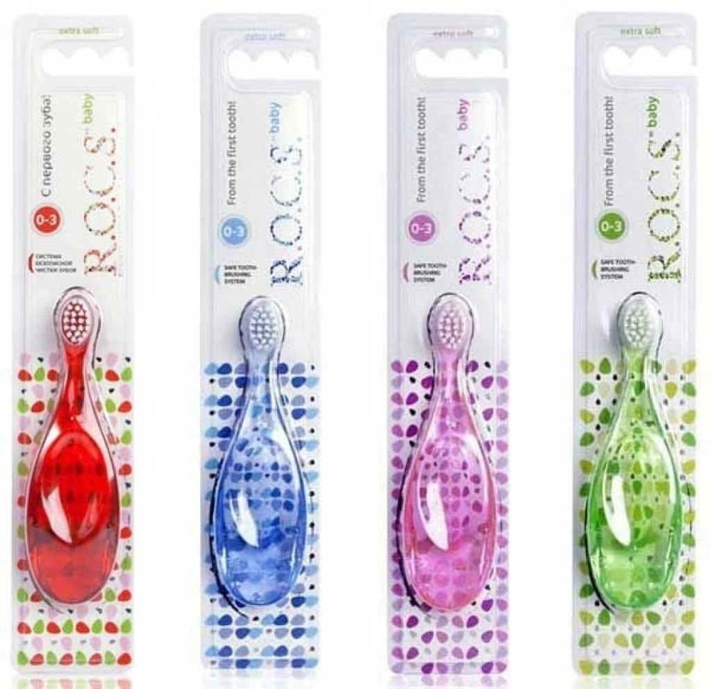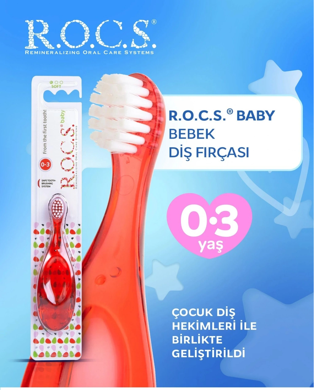 - R.O.C.S. Baby Ekstra Yumuşak Diş Fırçası, bebeklerin ağız ve diş sağlığını korurken erken dönemde diş fırçalama alışkanlığı kazandırılmasına yardımcı olacak bir çözüm sunar.