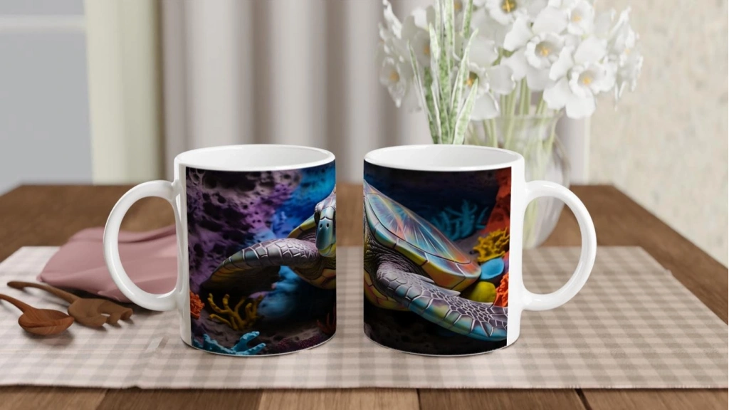 Canlı renk paletiyle göz kamaştıran bu kaplumbağalı kupa bardak, her yudumda su altı dünyasının enerjisini ve zarafetini hissettiriyor.