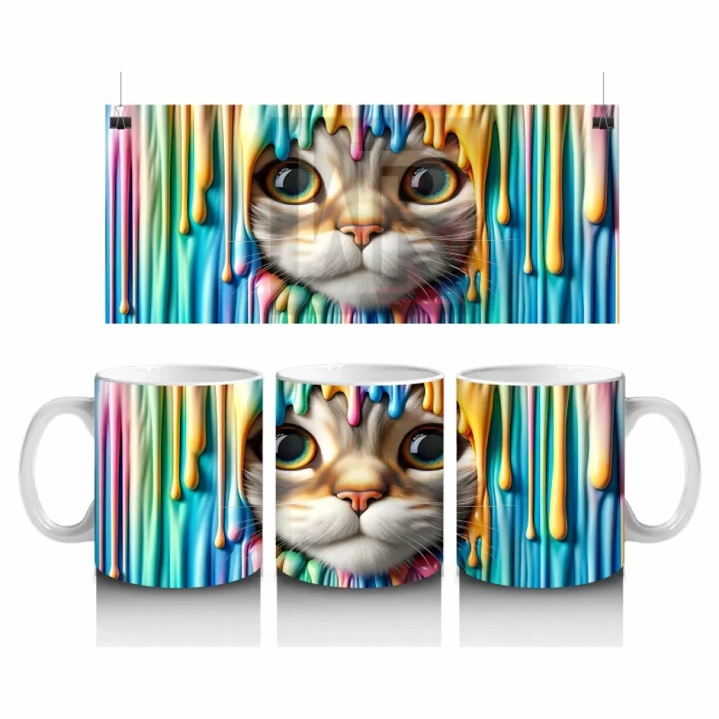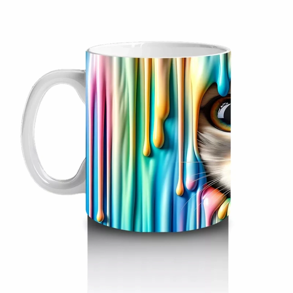 Canlı renklerle bezenmiş arka planda büyük gözlü sevimli kedi, neşeli ve etkileyici bir görünüm sunuyor. Enerjik ve tatlı tasarımlardan hoşlananlar için özel bir kupa.