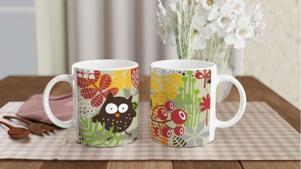 Renkli Baykuş ve Yaprak Desenli Kupa Bardak, doğa unsurlarıyla harmanlanmış eğlenceli çizgileriyle çocuk ruhunu yansıtan bir stilde tasarlandı.
