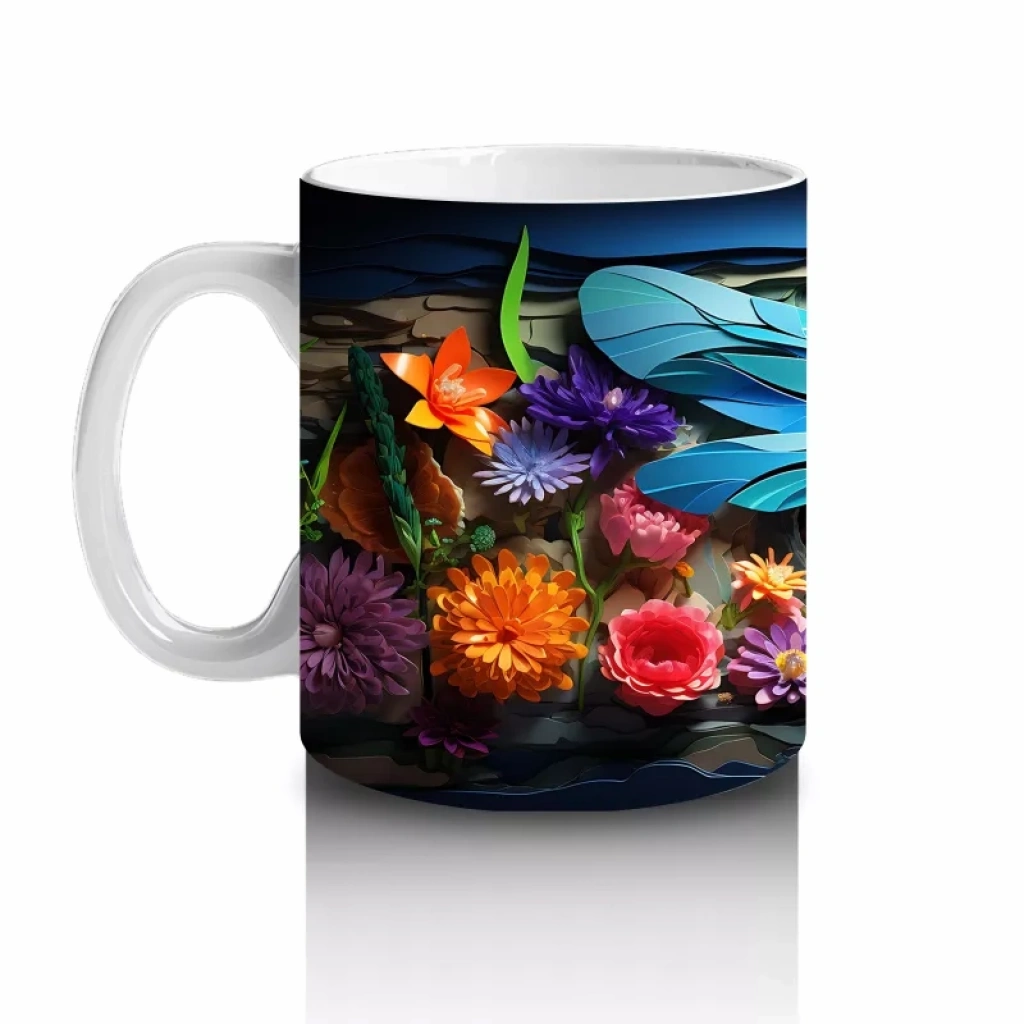 Renkli Çiçek Bahçesinde Çift Mavi Yusufçuk – Baskılı Kahve Kupası