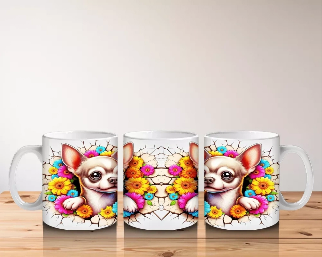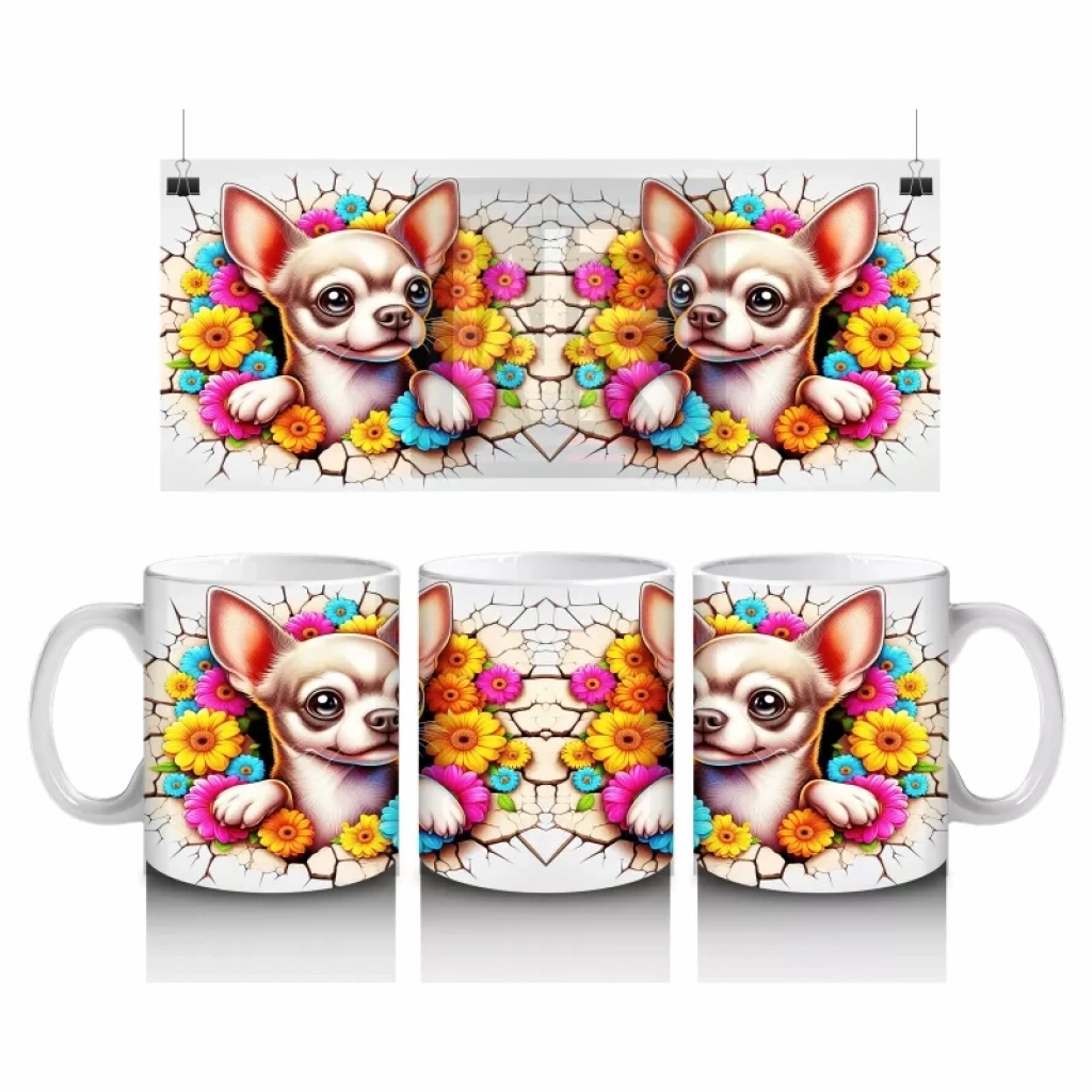 Renkli Çiçeklerle Süslenmiş Chihuahua Deseni - Baskılı kahve kupası