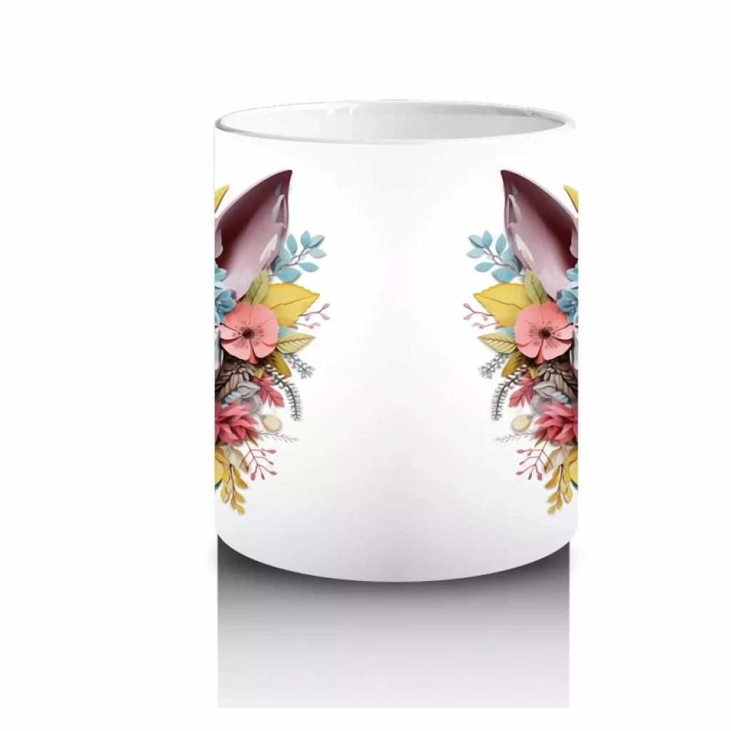 Renkli çiçeklerle süslenmiş köpek portresi, canlılık ve sevgi dolu bir görünüm sunuyor. Canlı ve estetik tasarımlar sevenler için ideal bir tasarım.