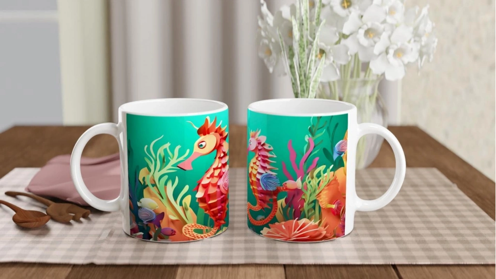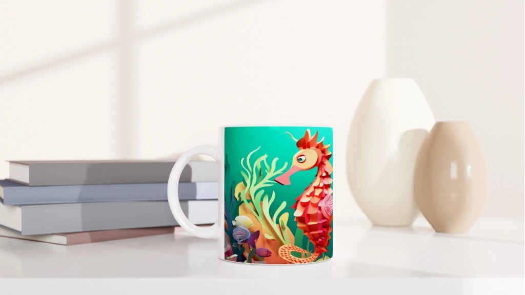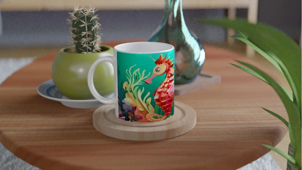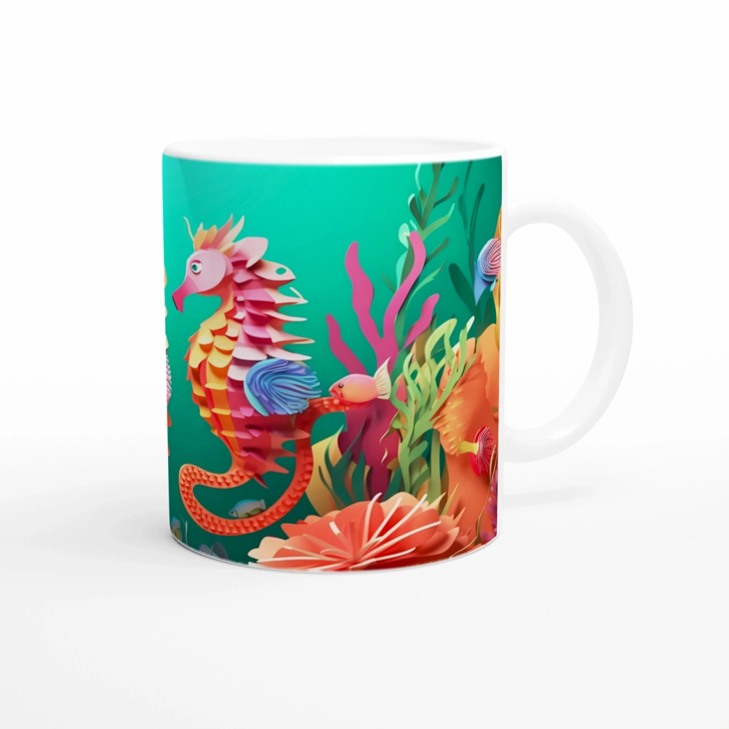 Mercanlar ve su bitkileri arasında yüzen denizatlarıyla bezeli bu su altı temalı kupa bardak, içecek keyfinize renk katıyor.