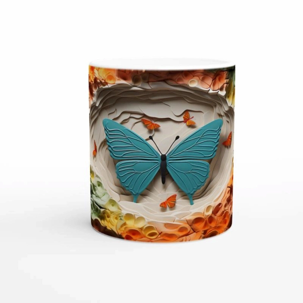 Renkli Doku Zeminli Mavi Kelebek Temalı Baskılı Kupa Bardak, sanatsal detayları ve üç boyutlu illüstrasyonu sayesinde hem dekoratif hem kullanışlı bir parça. Kupa koleksiyonuna özgünlük katmak isteyenlere özel!
