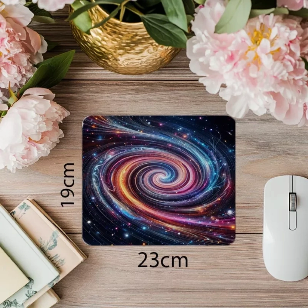 Renkli galaksi dönüşü efektiyle göz alıcı bir uzay atmosferi sunan bu mousepad, hem dekoratif hem de ilham verici bir masa aksesuarı.