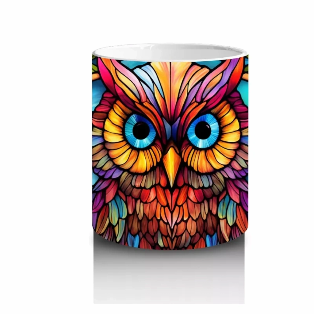 Renkli Mozaik Desenli Baykuş İllüstrasyonu – Baskılı Kahve Kupası