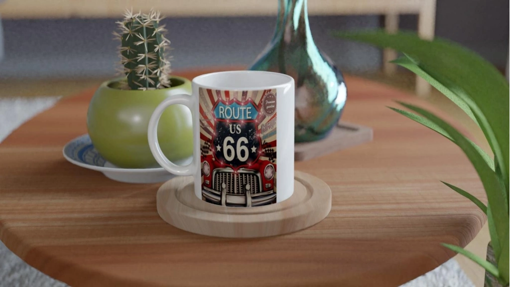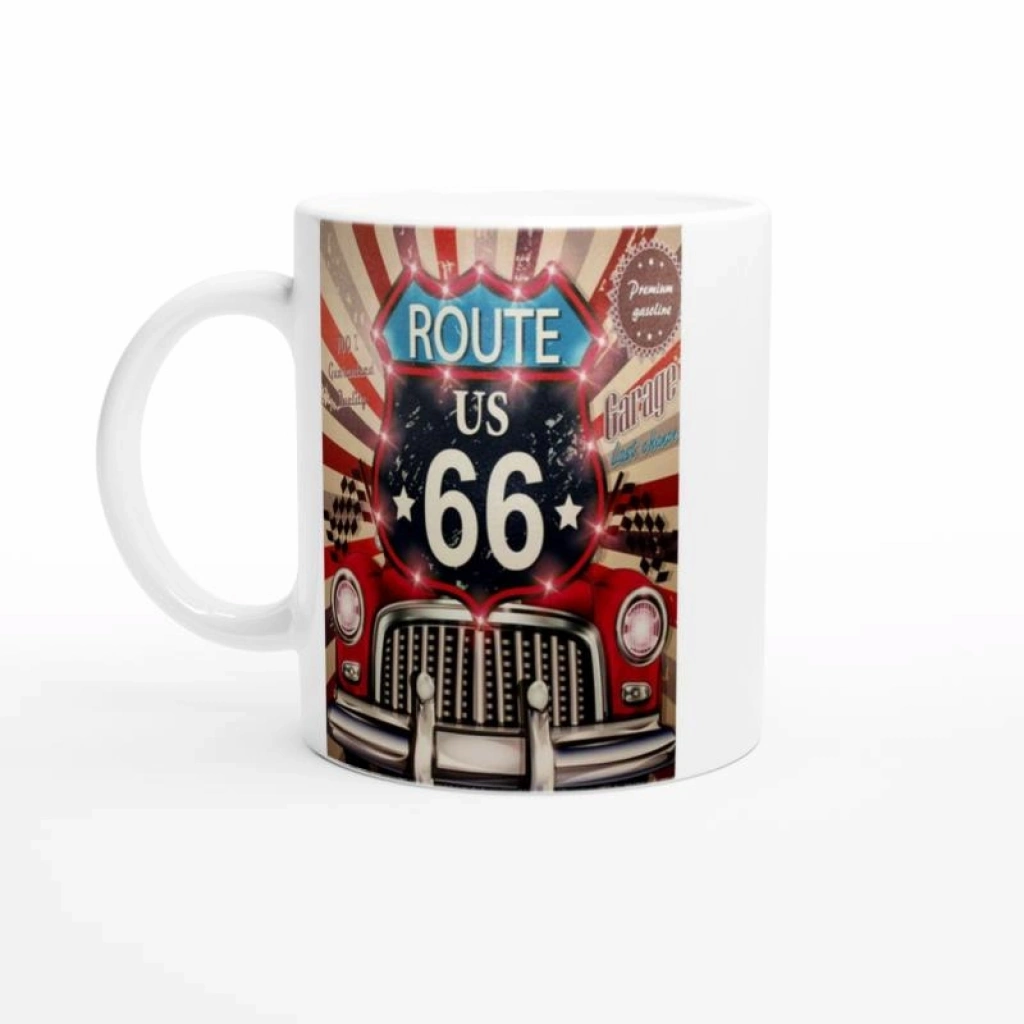 Işıltılı detaylar ve yarış bayraklarıyla süslenmiş bu Route 66 garaj kupası, hem dekoratif hem işlevsel bir hediye alternatifi sunar.