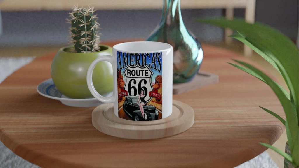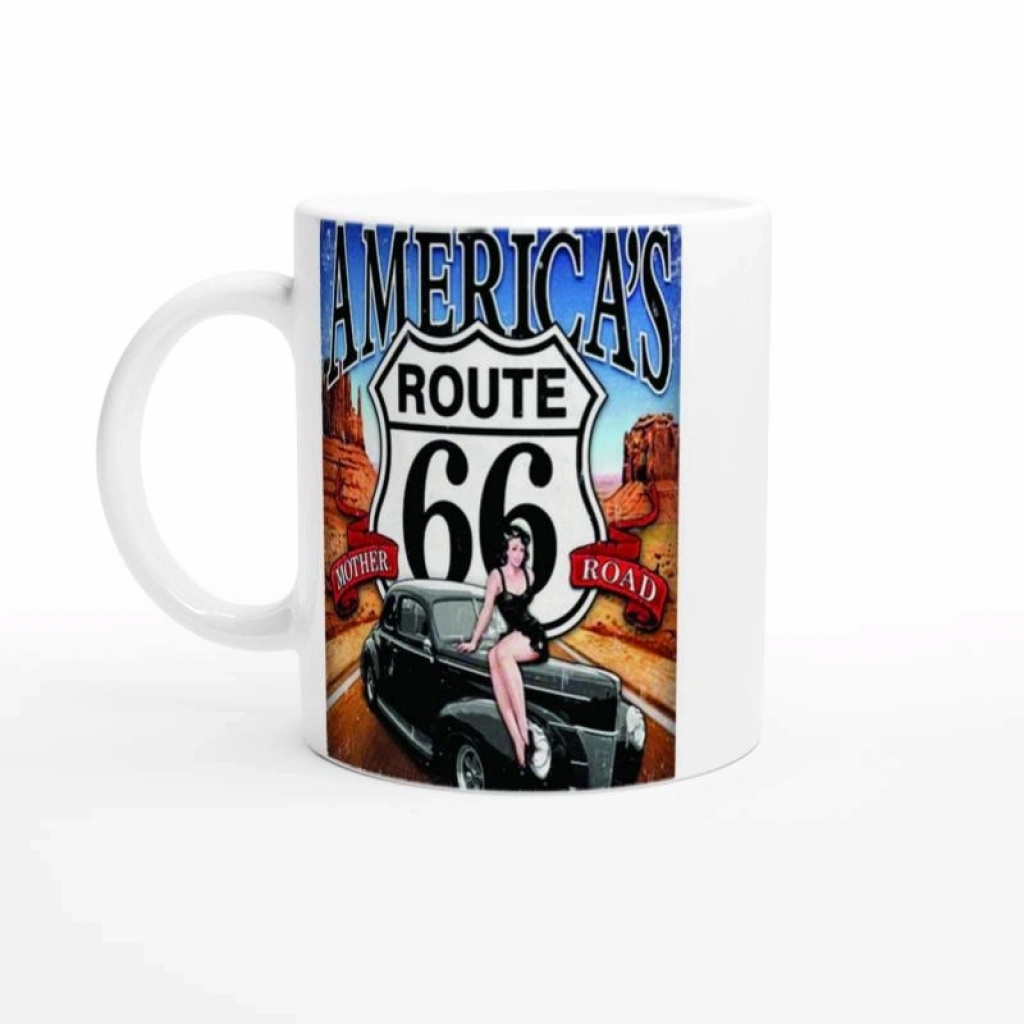 Efsanevi Route 66 tabelası, çöl manzarası ve siyah klasik araç üstündeki pin-up figürüyle koleksiyonluk bir parça.