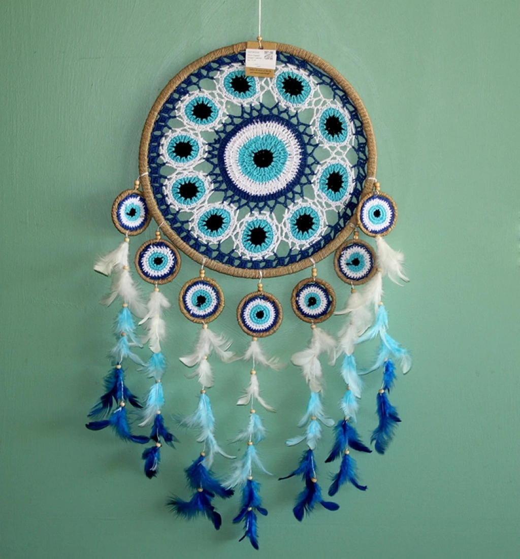 RÜYA KAPANI DREAM CATCHER MODEL 20Ürün ÖzellikleriRüya Kapanı Dream Catcher Model 20, iplerle işlenmiş nazar boncuğu süslemeleri ve mavi-beyaz tüyler ile tasarlanmış zarif bir üründür. Nazar boncuğu, kötü enerjilerden korunmayı simgelerken, mavi-beyaz tüyler huzur ve sakinlik sunar. Bu dream catcher, estetik bir görünüme sahip olup, hem koruyucu hem de dekoratif işlevi ile her alanda şıklık yaratır. Hafif yapısı sayesinde kolayca asılabilir ve evinize zarif bir dokunuş katar. Hem geleneksel hem de modern dekorasyon için mükemmel bir seçimdir.Paket İçeriği1 adet Rüya Kapanı Dream Catcher Model 20.