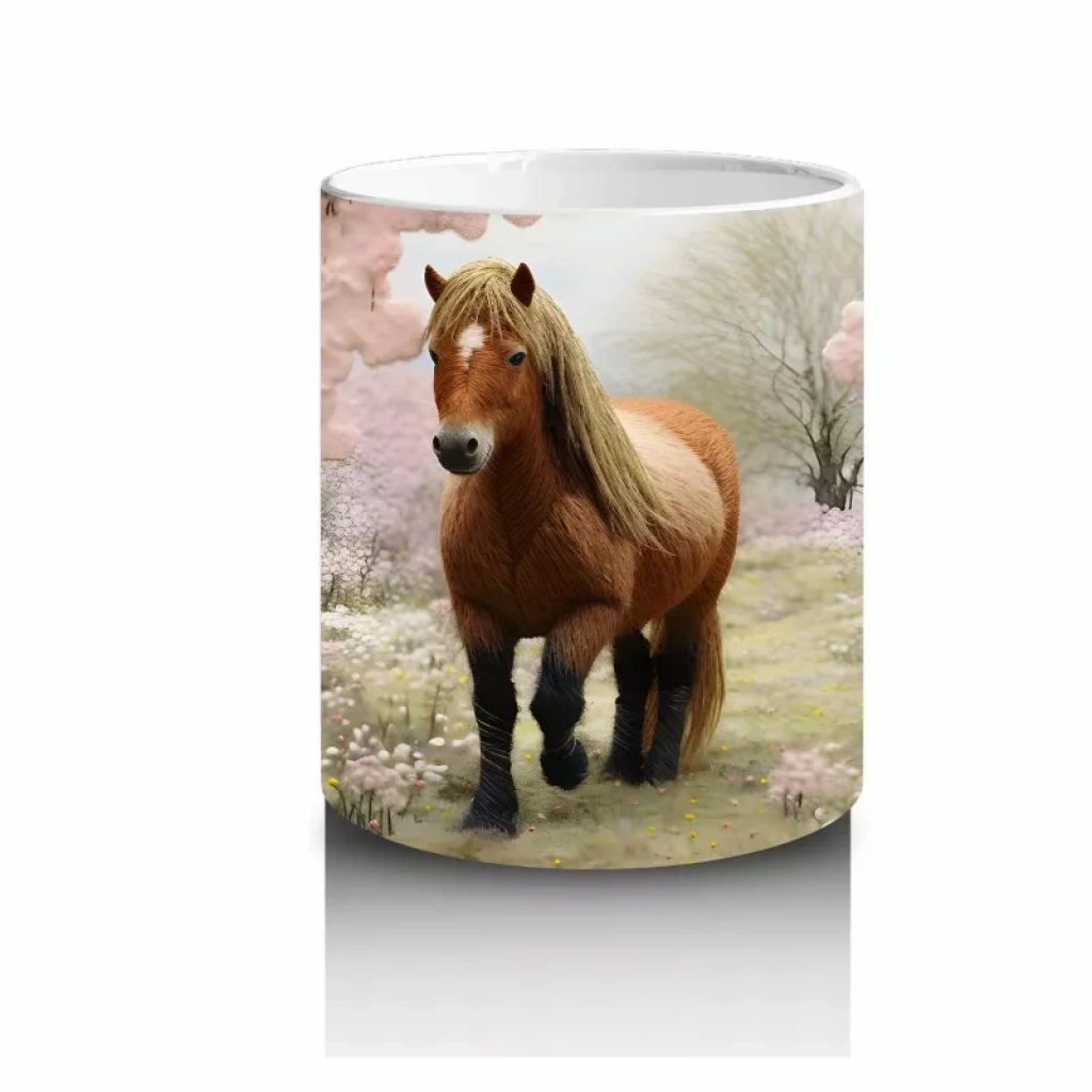 Sakura Ağaçları Arasında Yürüyen Gerçekçi At İllüstrasyonu – Baskılı Kahve Kupası
