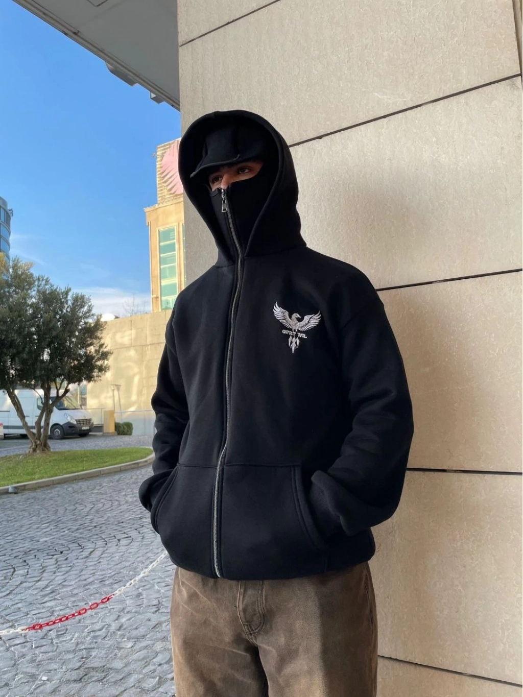 Samuray kapüşonlu ZIP Fermuarlı kapüşonlu SweatShirt - Siyah