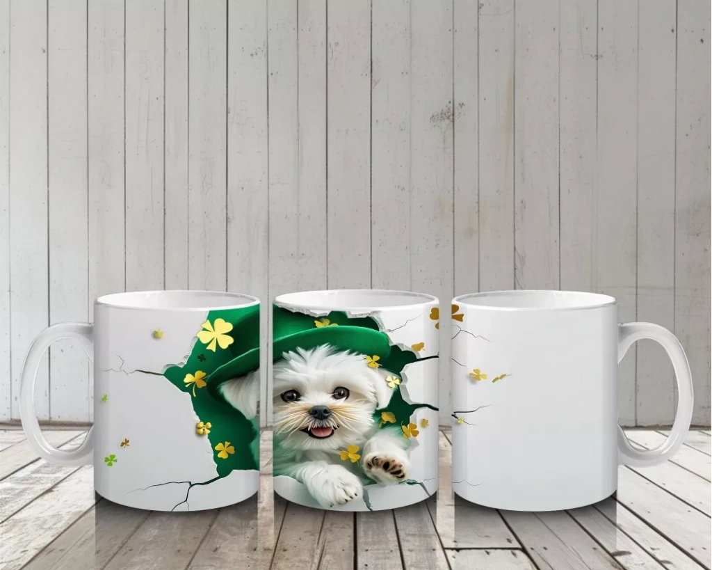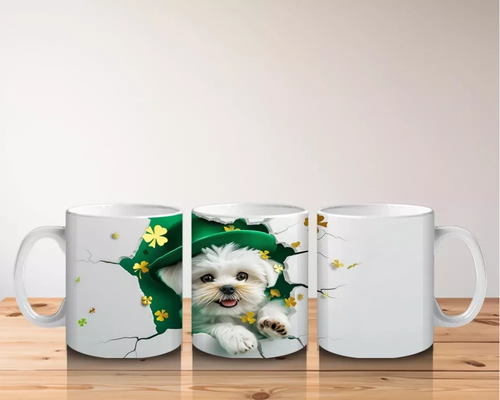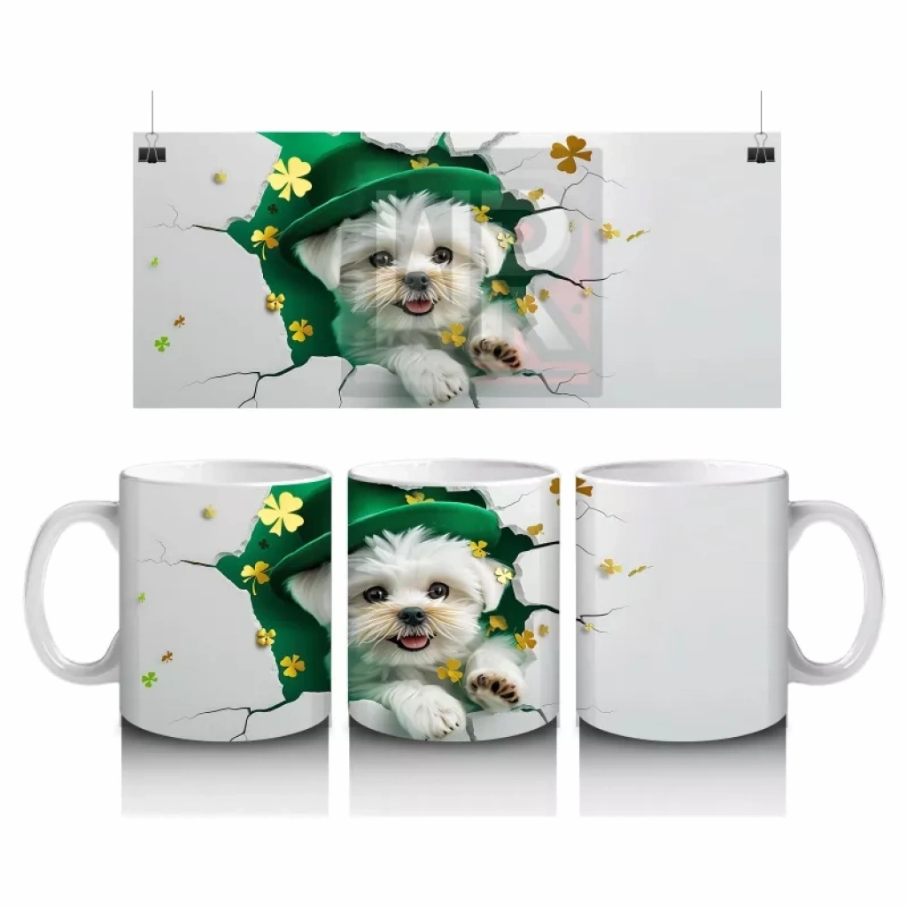 Şans Şapkası Takan Beyaz Yavru Köpek – Baskılı Kahve Kupası