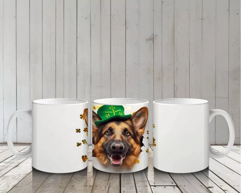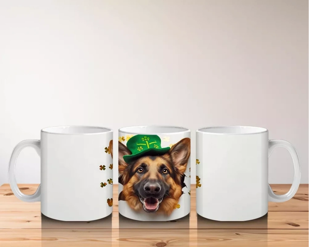 Şans Sembolleriyle Çevrili Leprechaun Alman Kurdu – Baskılı Kahve Kupası
