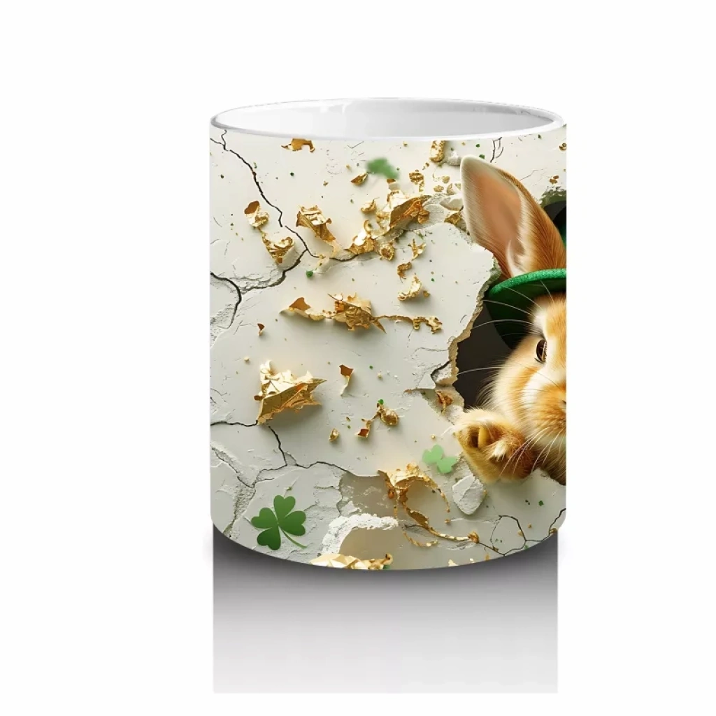 Şapka takmış sevimli tavşan, etrafını saran yonca süsleriyle şans ve doğa temasını bir araya getiriyor. Neşeli ve eğlenceli detaylardan hoşlananlar için renkli bir kupa seçimi.