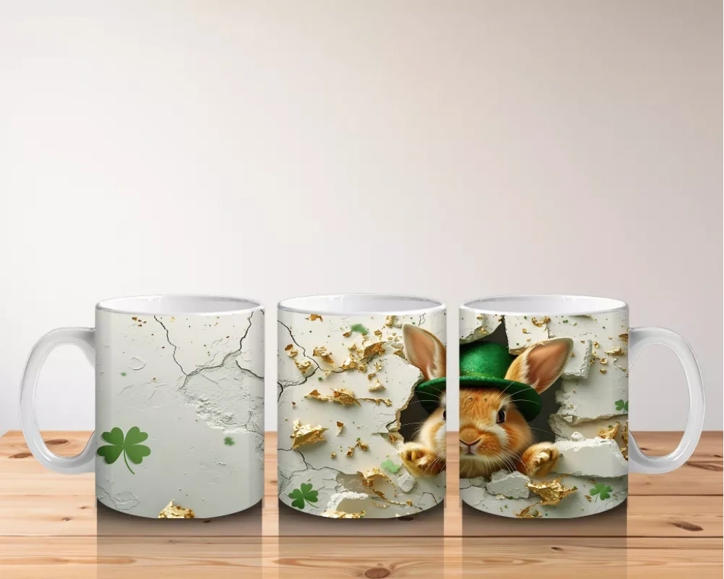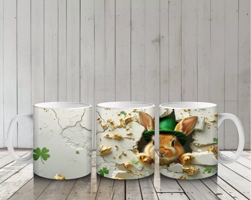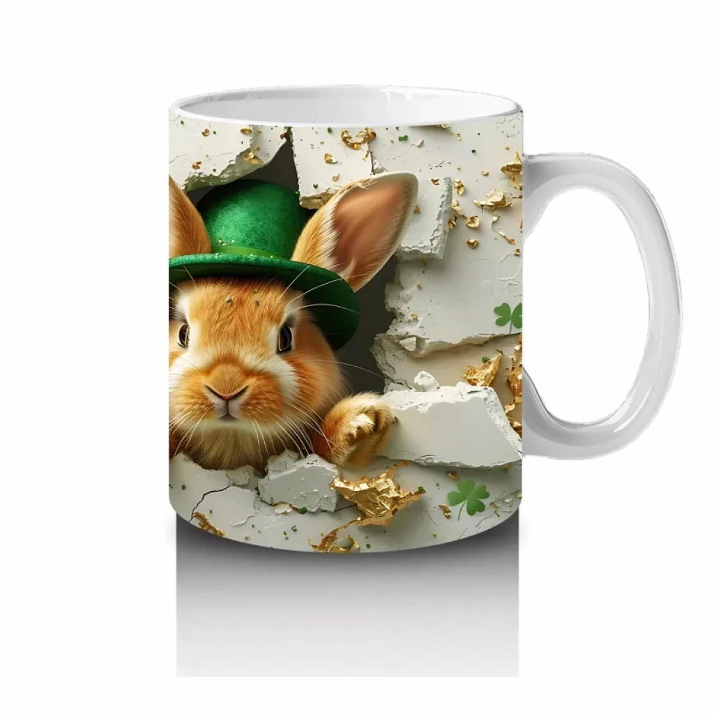 Şapkalı Tavşan ve Yonca Süsleri – Baskılı Kahve Kupası