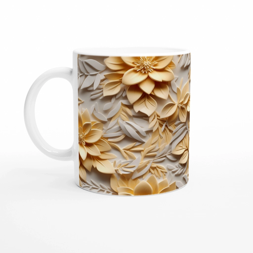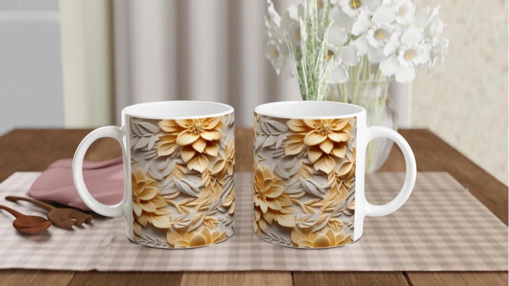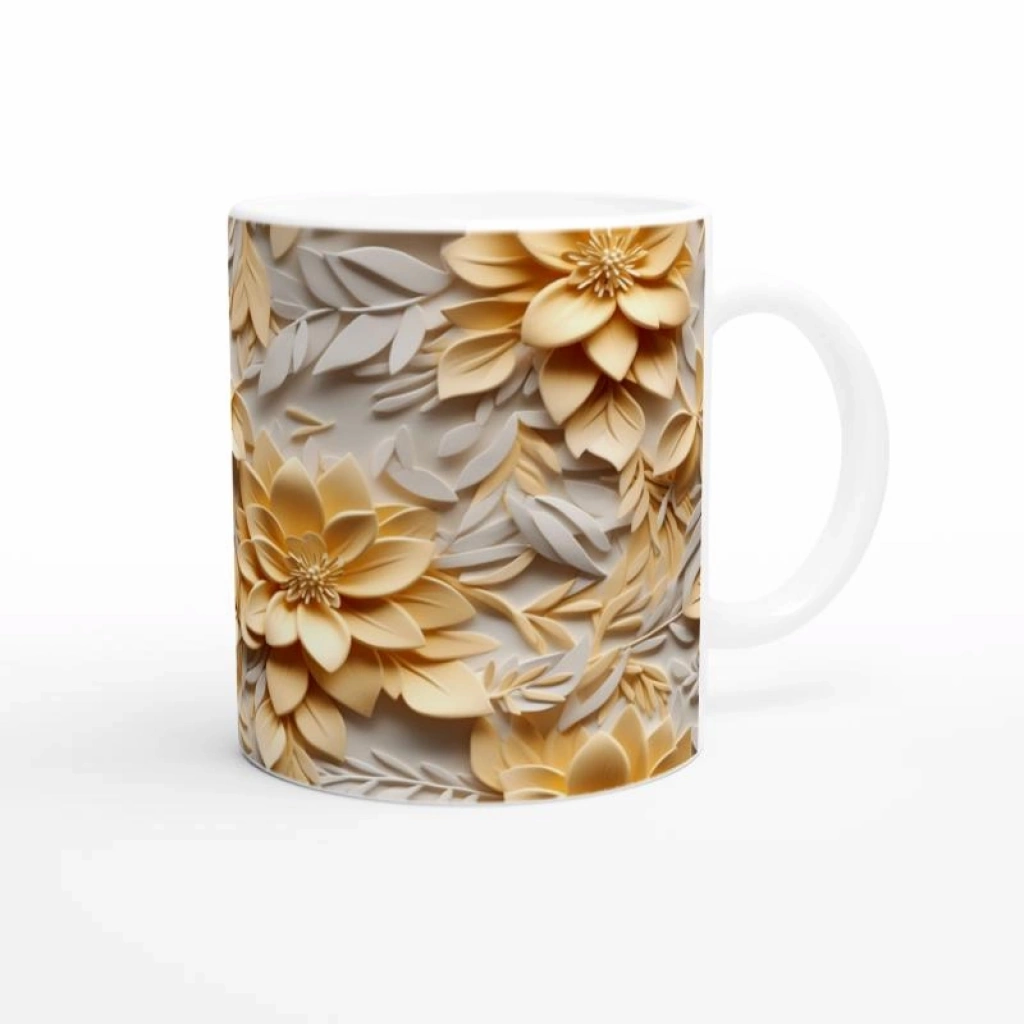Kat kat açılmış çiçek motifleri ve akıcı yaprak hatları sayesinde bu özel tasarım kupa bardak, hem lüks bir görünüm hem de estetik bir kullanım sunuyor.