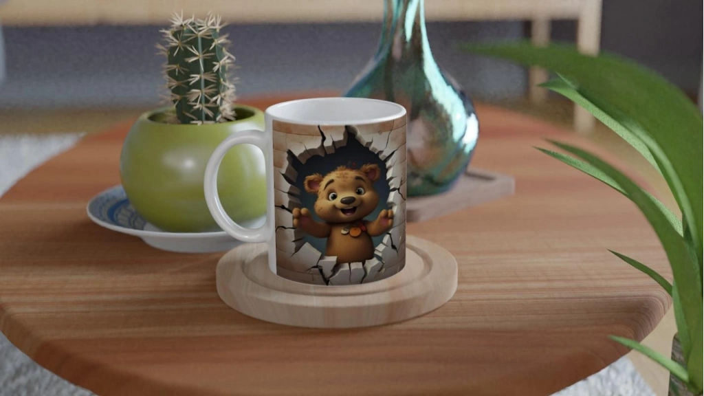 Duvarı delen enerjik bir ayıcık figürüyle tasarlanan bu baskılı kupa bardak,
