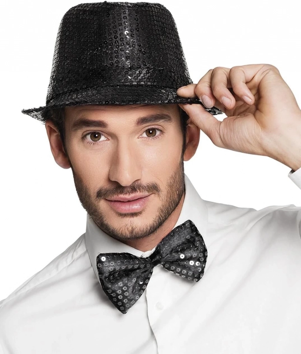 • Siyah Payetli Şapka Ve Papyon Seti – Parıltılı Yetişkin Kostüm Seti