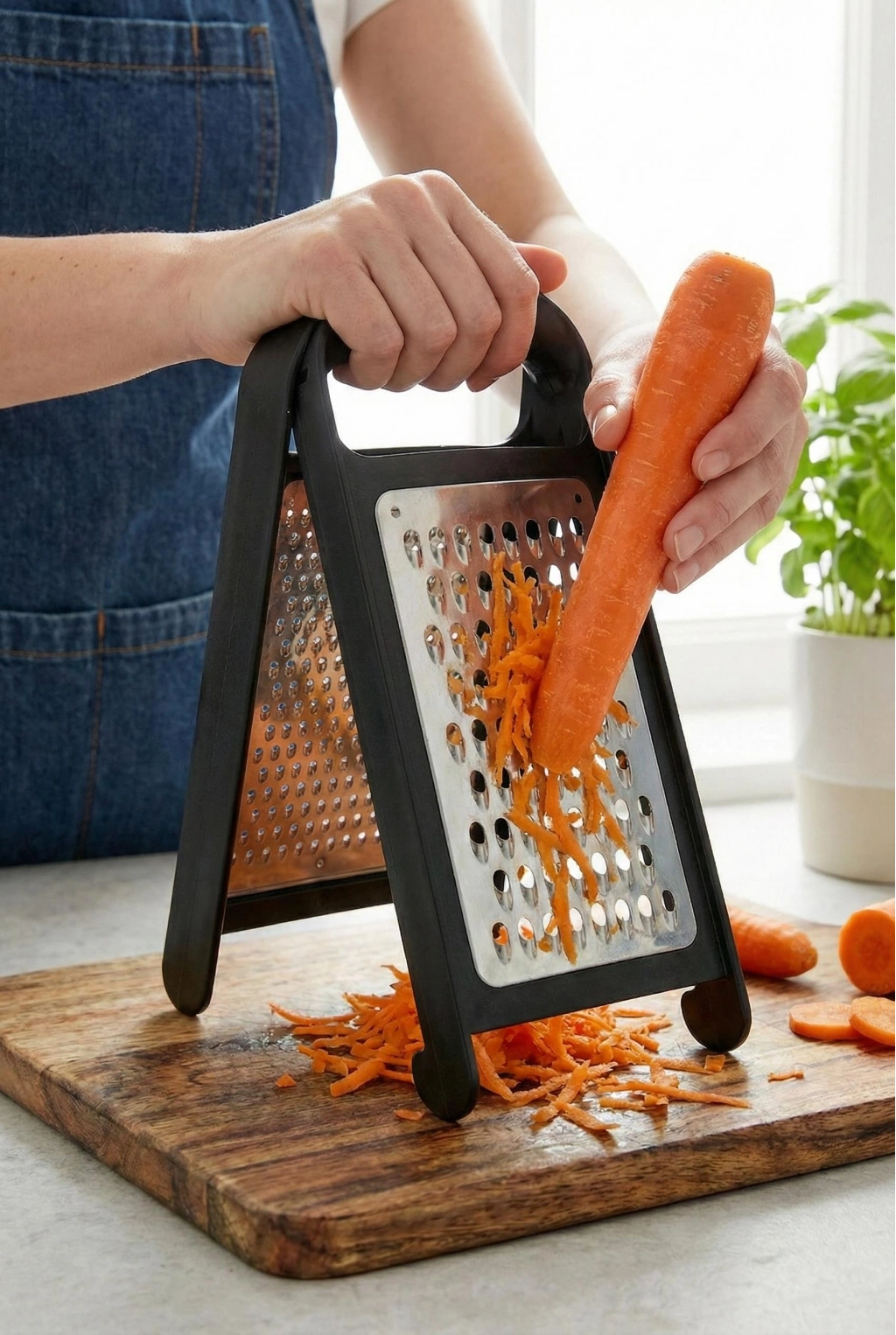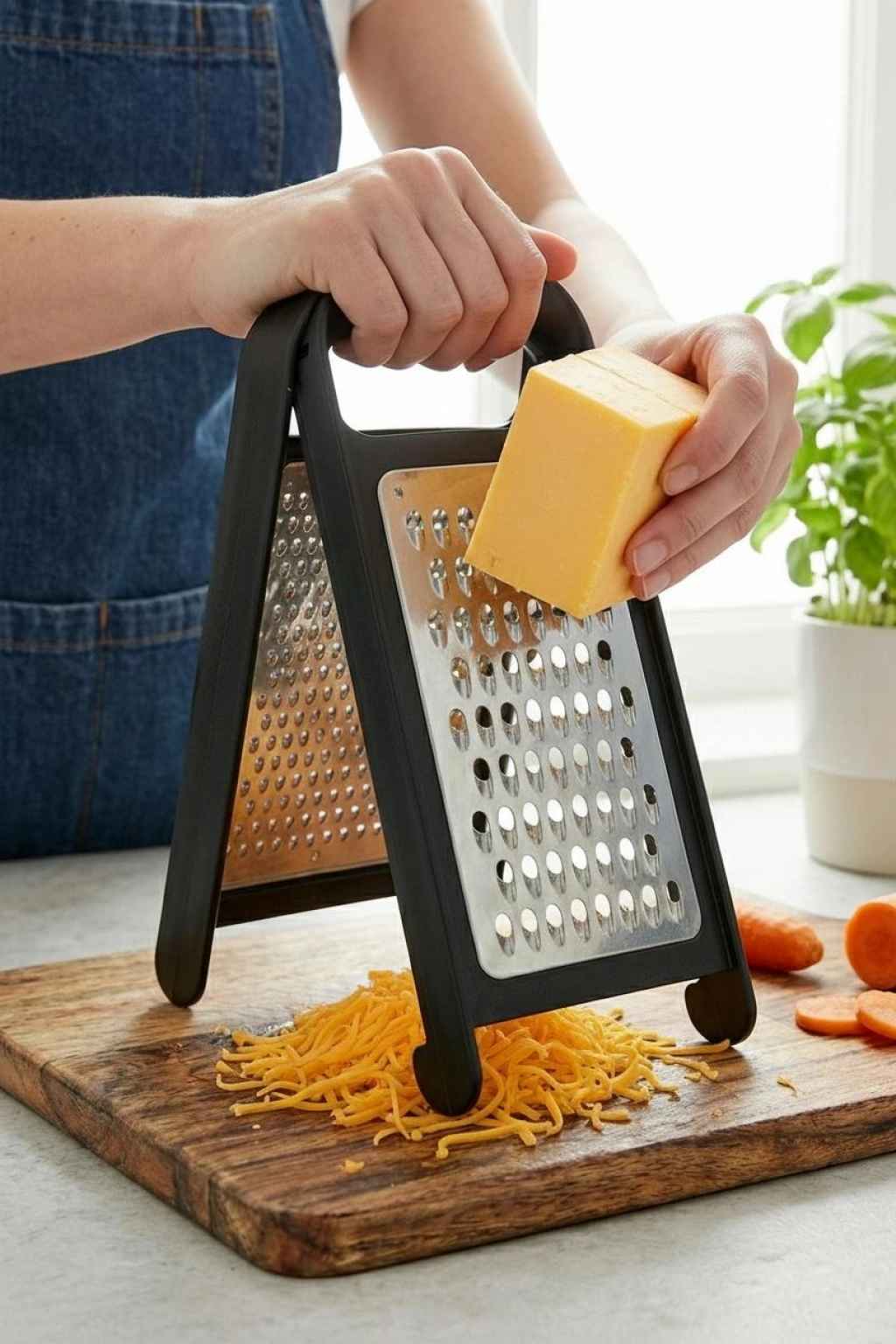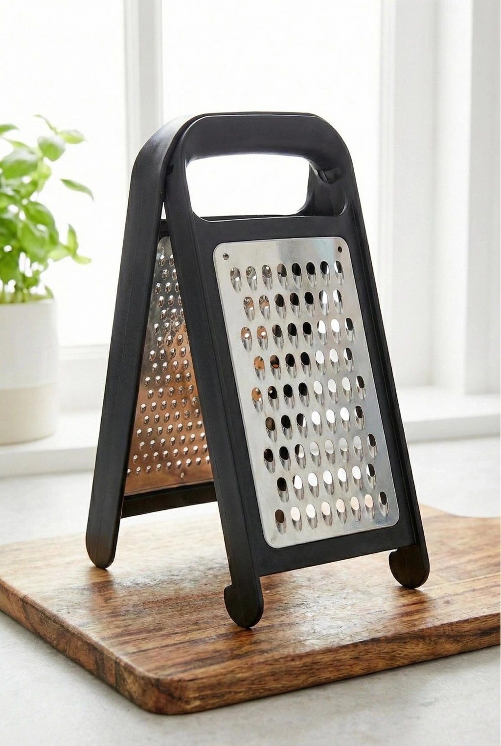 Mutfakta yer tasarrufu ve verimliliği bir araya getiren bu siyah renkli katlanabilir rende, keskin paslanmaz çelik yüzeyiyle peynirlerden sebzelere kadar her şeyi zahmetsizce hazırlamanızı sağlar.