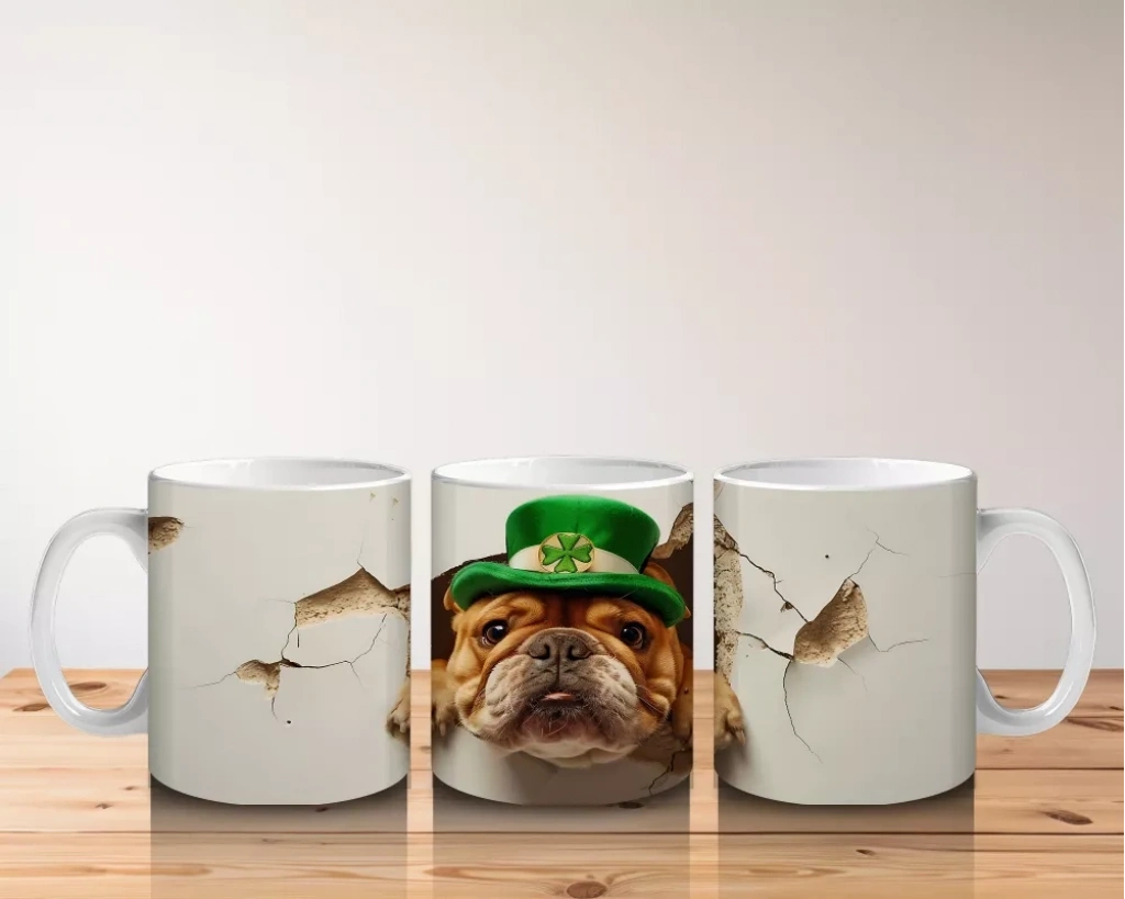 St. Patrick temalı şapka takan bulldog, kutlama ve eğlence havasını sıcak ve neşeli bir şekilde yansıtıyor. Tematik ve sevimli tasarımlar arayanlar için ideal.