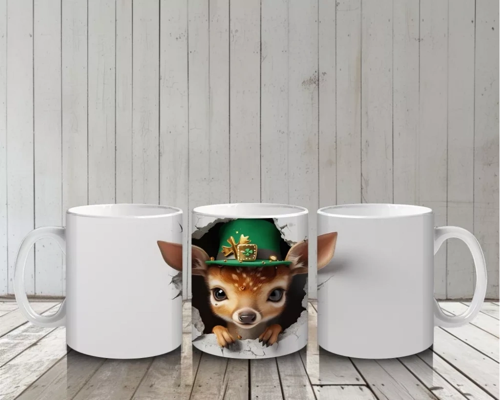 St. Patrick Şapkası Takmış Sevimli Geyik Yavrusu – Duvarı Delen 3D Kupa Tasarımı