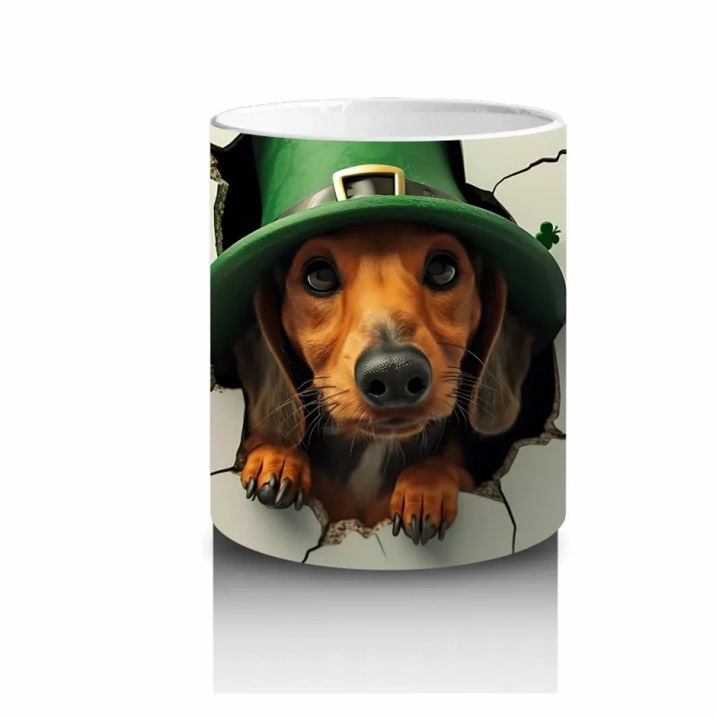 St. Patrick’s şapkası takan Dachshund, çatlak zeminden meraklı gözlerle bakıyor. Sevimli ve kutlama temalı detayları tercih edenlere özel bir tasarım.