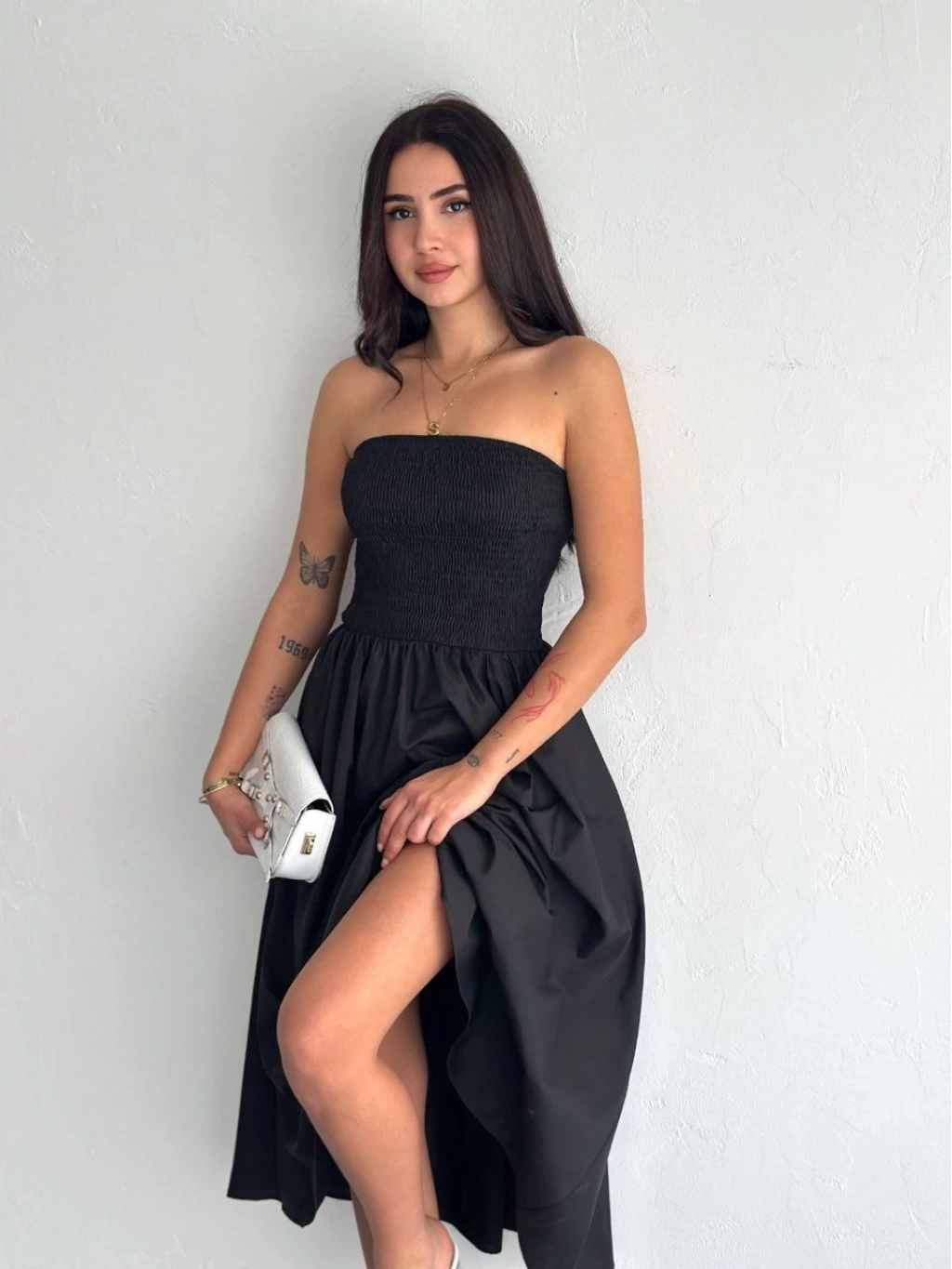 Straplez Pileli Elbise - Siyah
