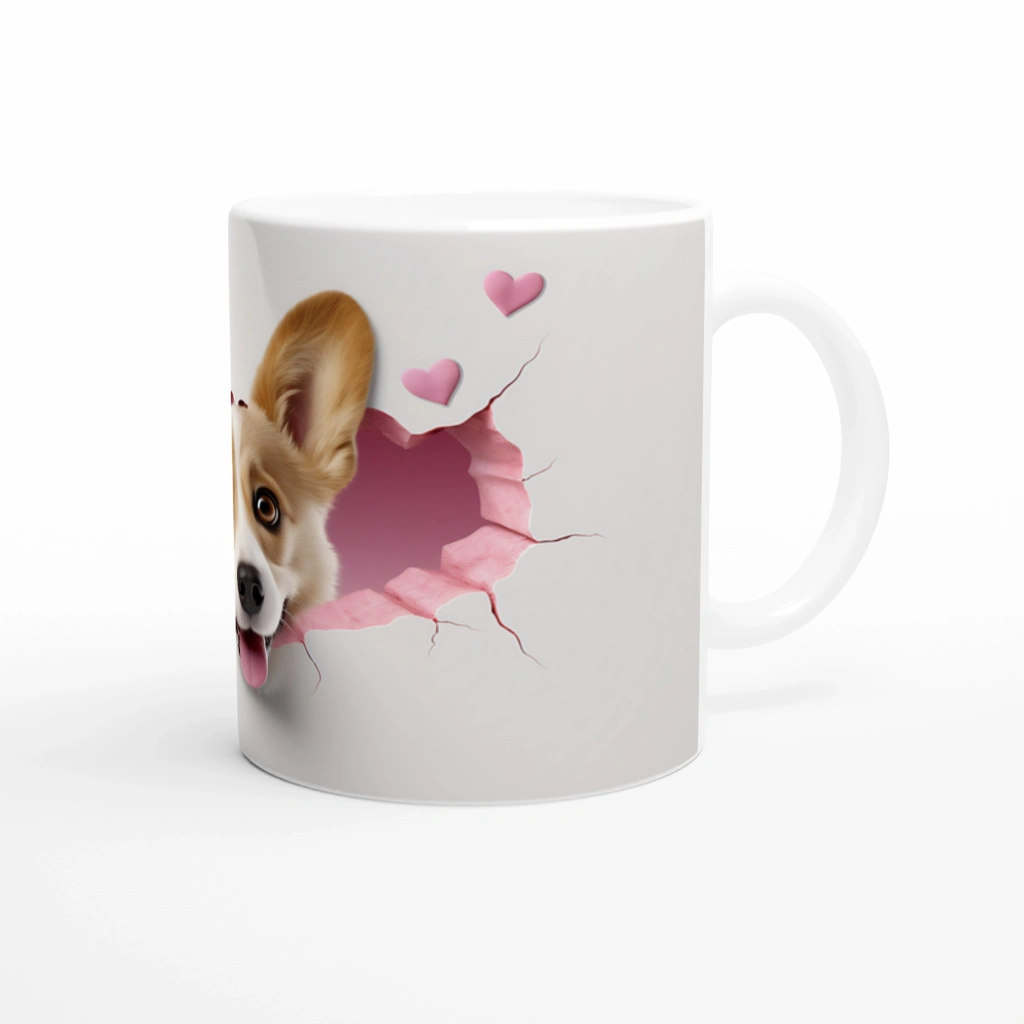 Tatlı Corgi Köpeği Kırık Duvar Efektli Baskılı Kupa Bardak, duvardan fırlamış gibi görünen neşeli köpek illüstrasyonuyla her yudumda gülümsetiyor. Hem ev dekorasyonuna hem kahve keyfine renk katmak için mükemmel bir hediye.