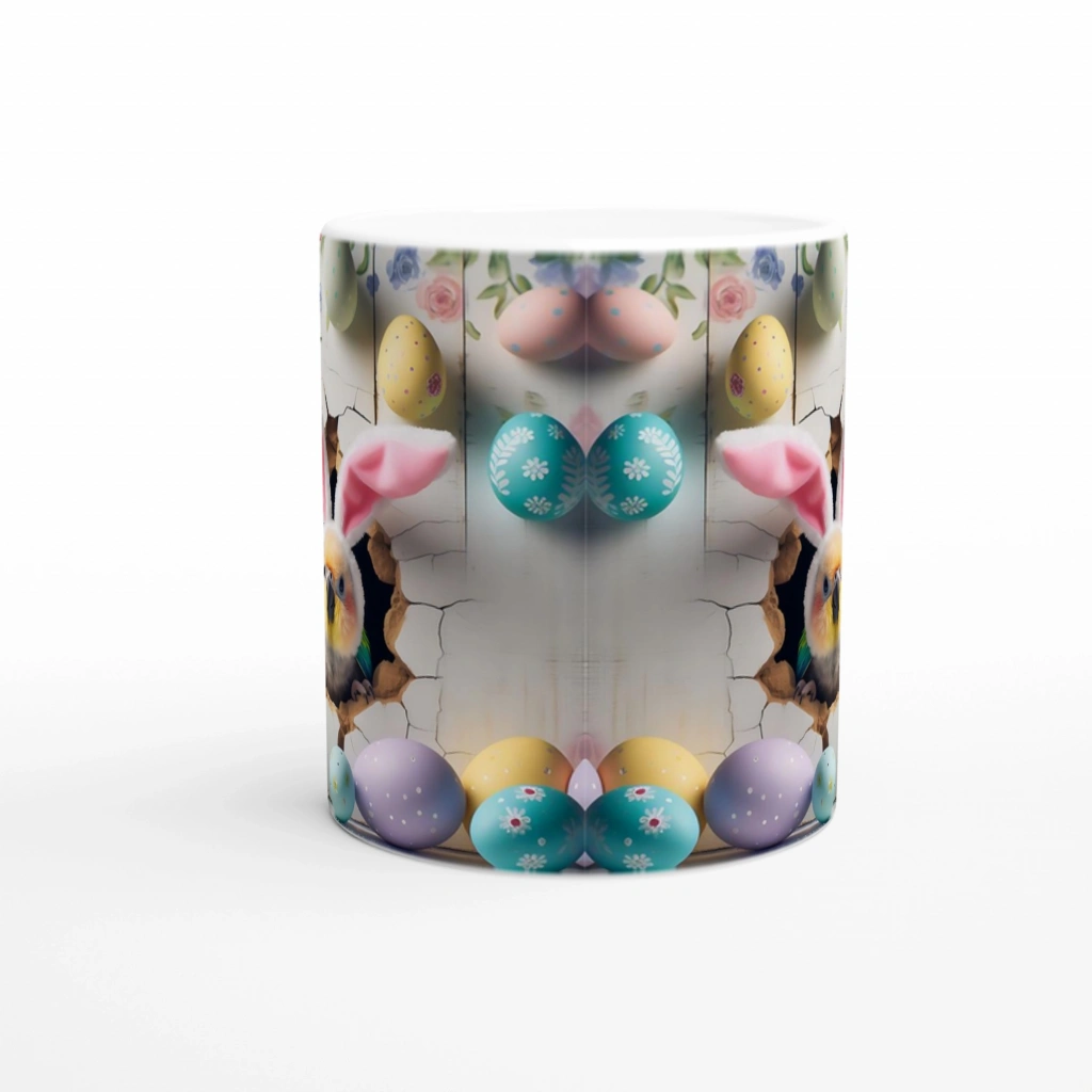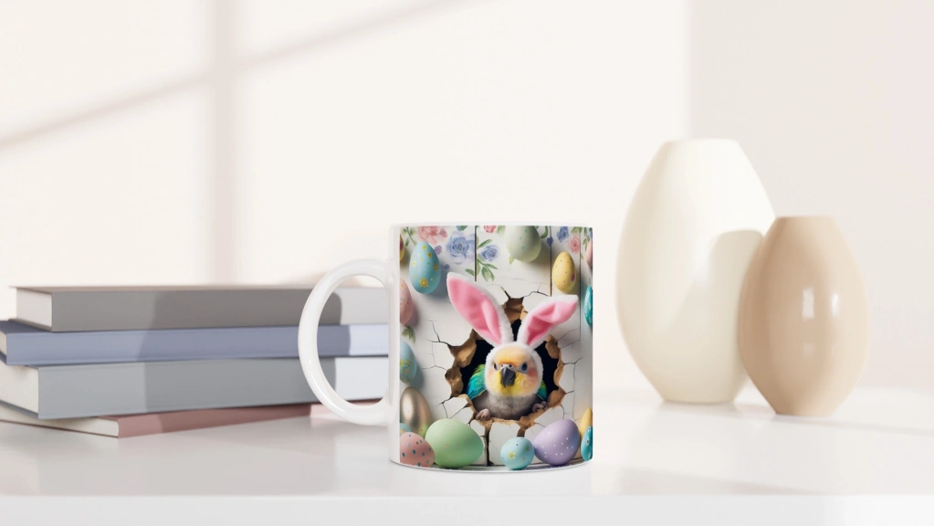 Tavşan Kulaklı Papağan ve Paskalya Yumurtaları Temalı Baskılı Kupa Bardak, çatlak duvar efektiyle süslenmiş arka planı, desenli yumurtalar ve pastel renkli çiçeklerle tamamlanarak eğlenceli bir atmosfer sunuyor. Özellikle bahar temalı kutlamalar ve neşeli hediye alternatifleri için harika bir tercih.
