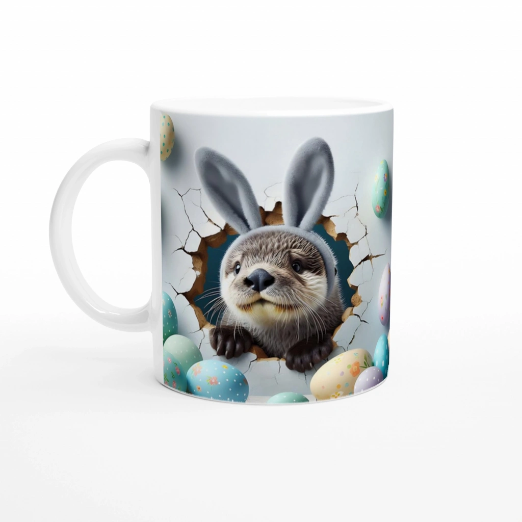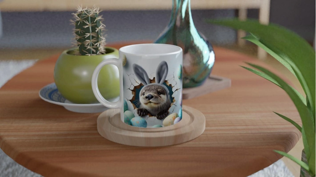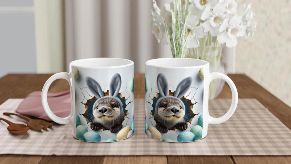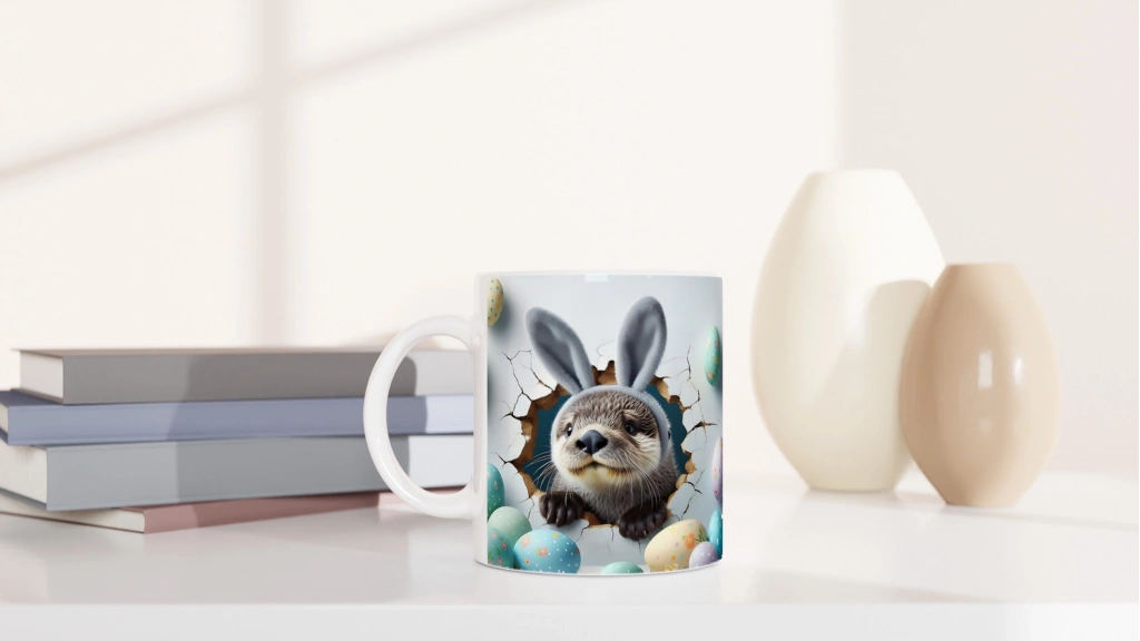 Tavşan Kulaklı Su Samuru Temalı Baskılı Kupa Bardak, çatlak duvar efektinden sevimli şekilde bakan su samuruyla sıcak içeceklerinize keyif katıyor. Renkli yumurta desenleriyle süslenmiş bu özel tasarım, çocuklara ve neşeyi seven herkese hitap ediyor.