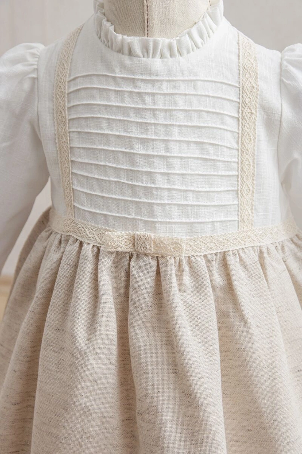 Pudra ve Bej rengin zarifliğiyle tasarlanan bu kız bebek elbisesi, modern çizgileri ve şık detaylarıyla dikkat çekiyor.