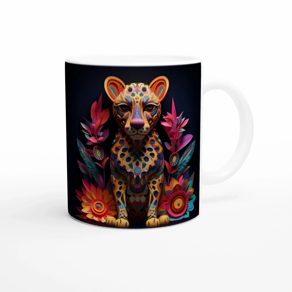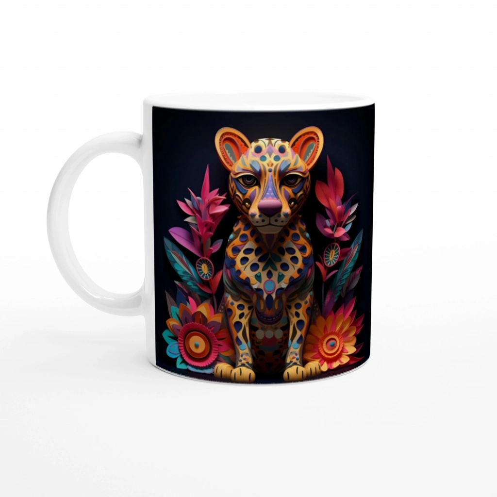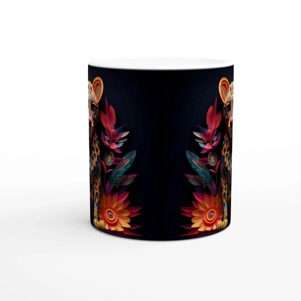 Bu özel kupa bardakta, tropikal çiçekler arasına gizlenmiş zarif ve dikkat çekici bir leopar yer alıyor.