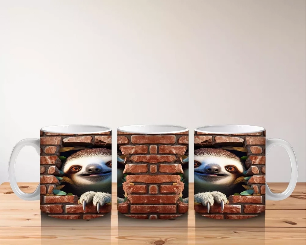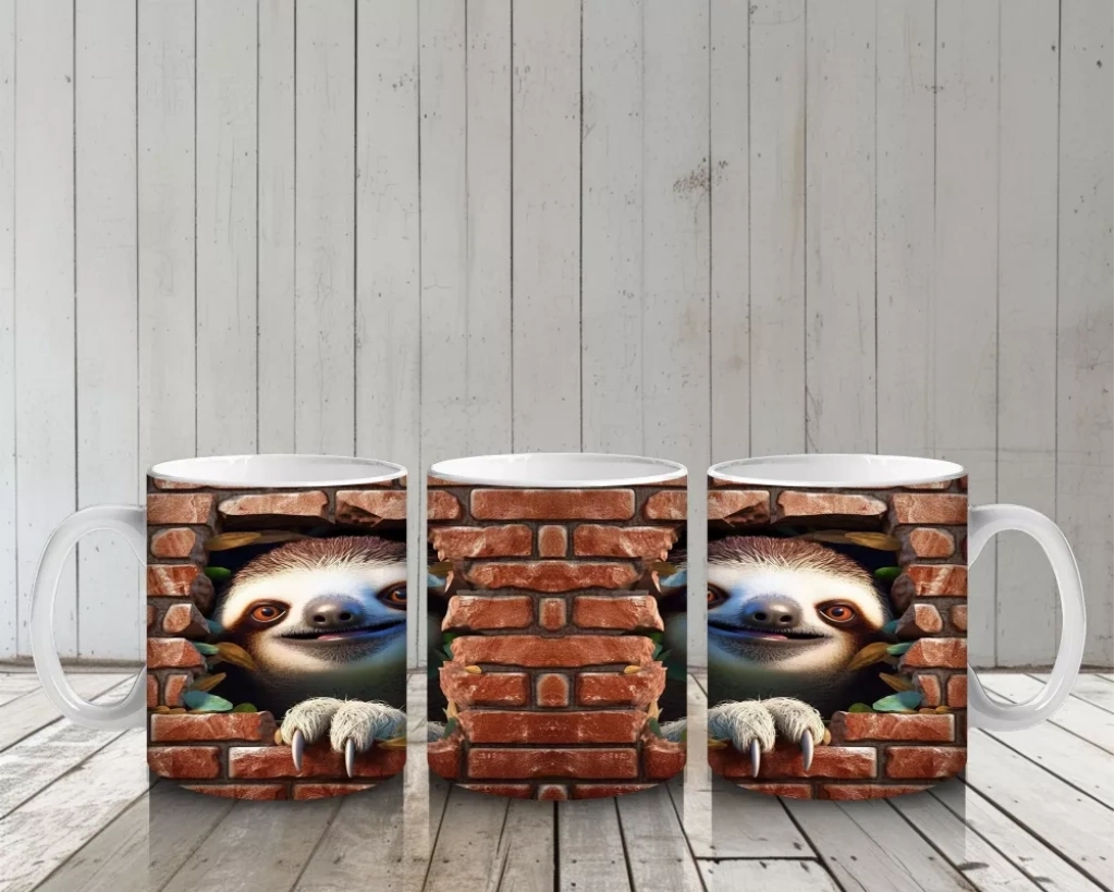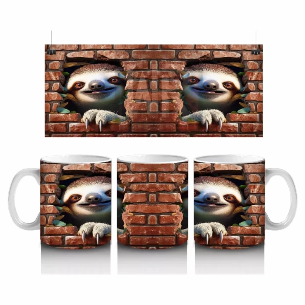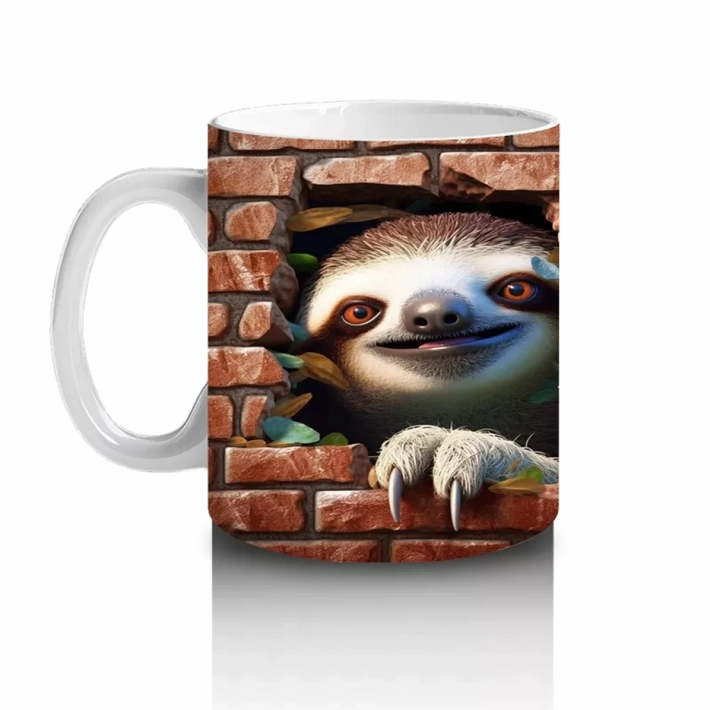Tuğla Duvar Önünde Gülümseyen Tembel Hayvan – Baskılı Kahve Kupası