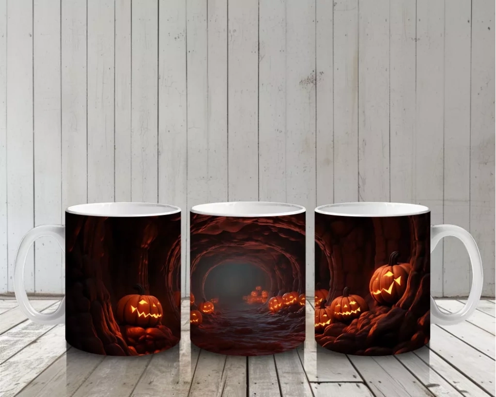 Labirent Gibi Tünelde Gülümseyen Kabaklar – Hediyelik Kahve Kupası Dolambaçlı bir tünelde sevimli bir şekilde gülümseyen balkabakları, bu Cadılar Bayramı baskılı kupayı eğlenceli kılıyor. Mizahi ve tematik bir hediyelik kahve kupası alternatifidir.