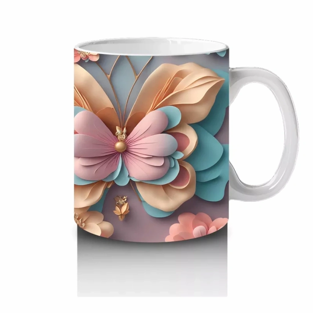 Turkuaz Tonlarda Çiçekli Kelebek İkilisi – Baskılı Kahve Kupası