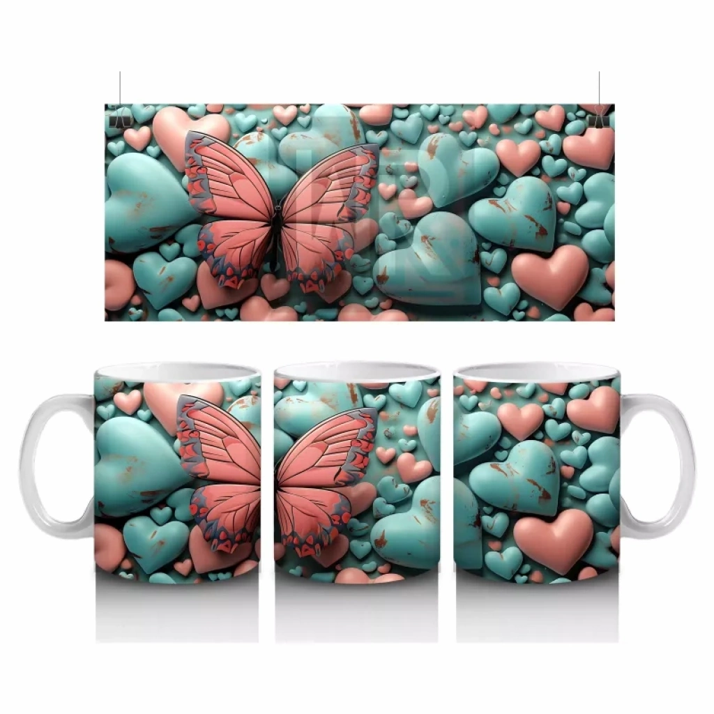 Turkuaz ve pembe kalplerle çevrelenmiş kelebek figürü, canlı renklerle neşeli ve enerjik bir görünüm sunuyor. Renkli ve pozitif detaylardan hoşlananlar için göz alıcı bir tasarım.