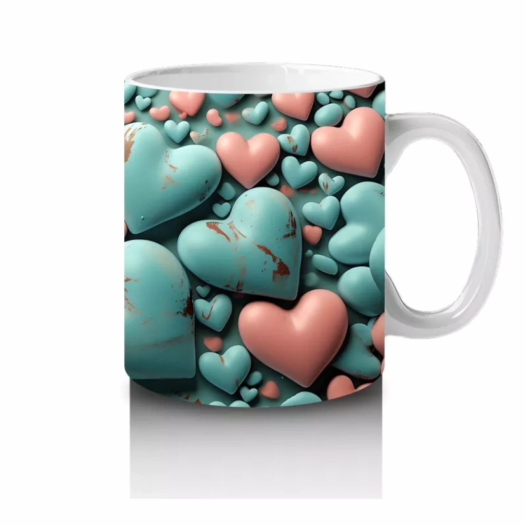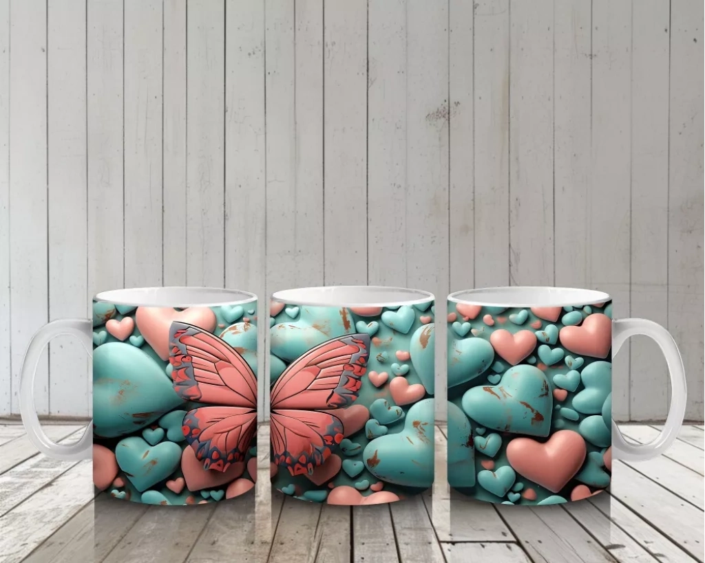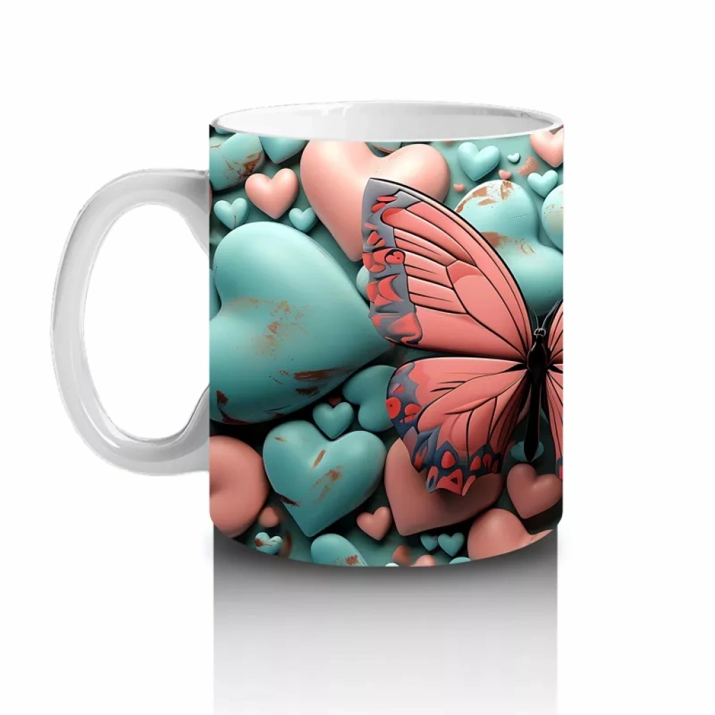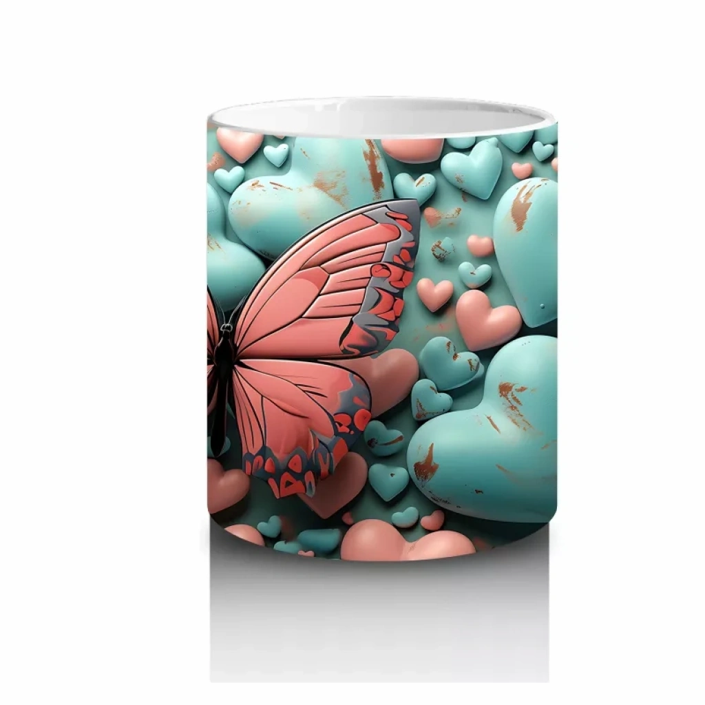 Turkuaz ve Pembe Kalplerle Süslenmiş Kelebek – Baskılı Kahve Kupası