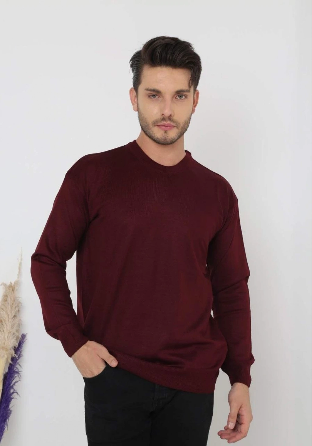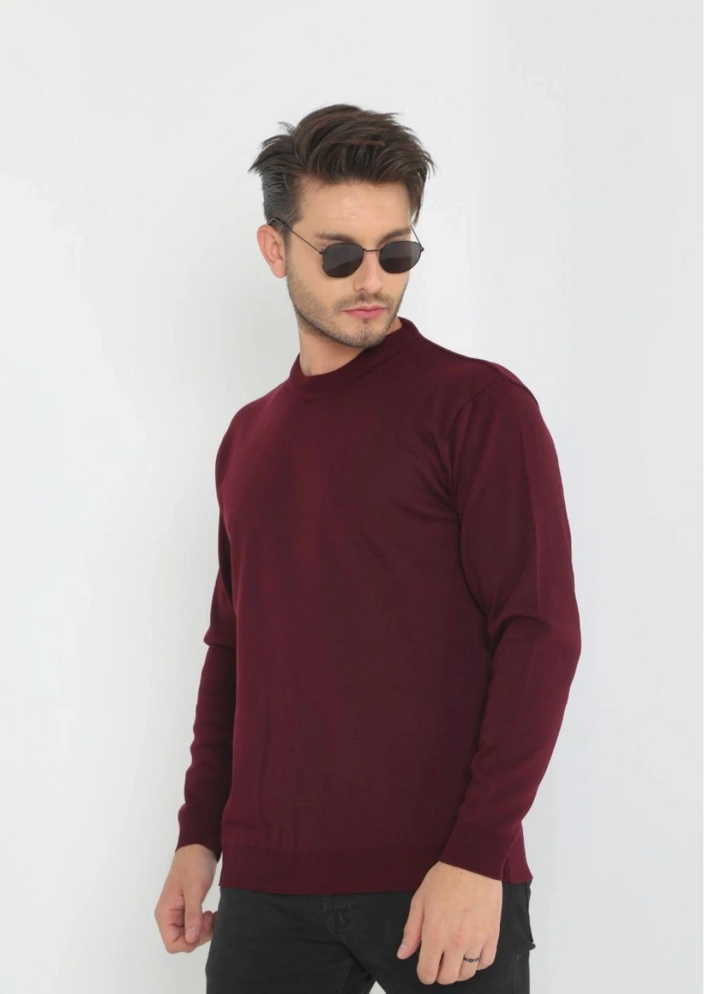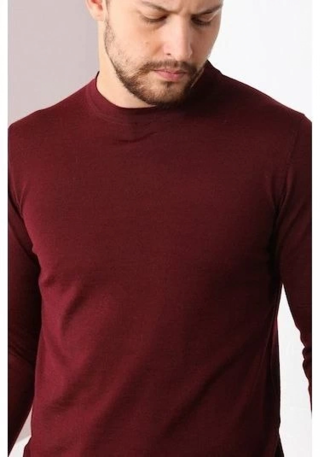 Uzun Kol Biskilet Yaka Dokuma Triko - Bordo