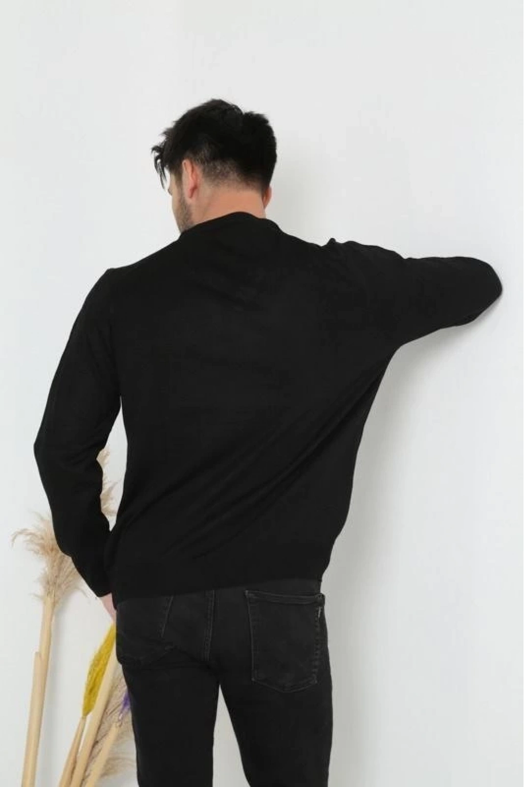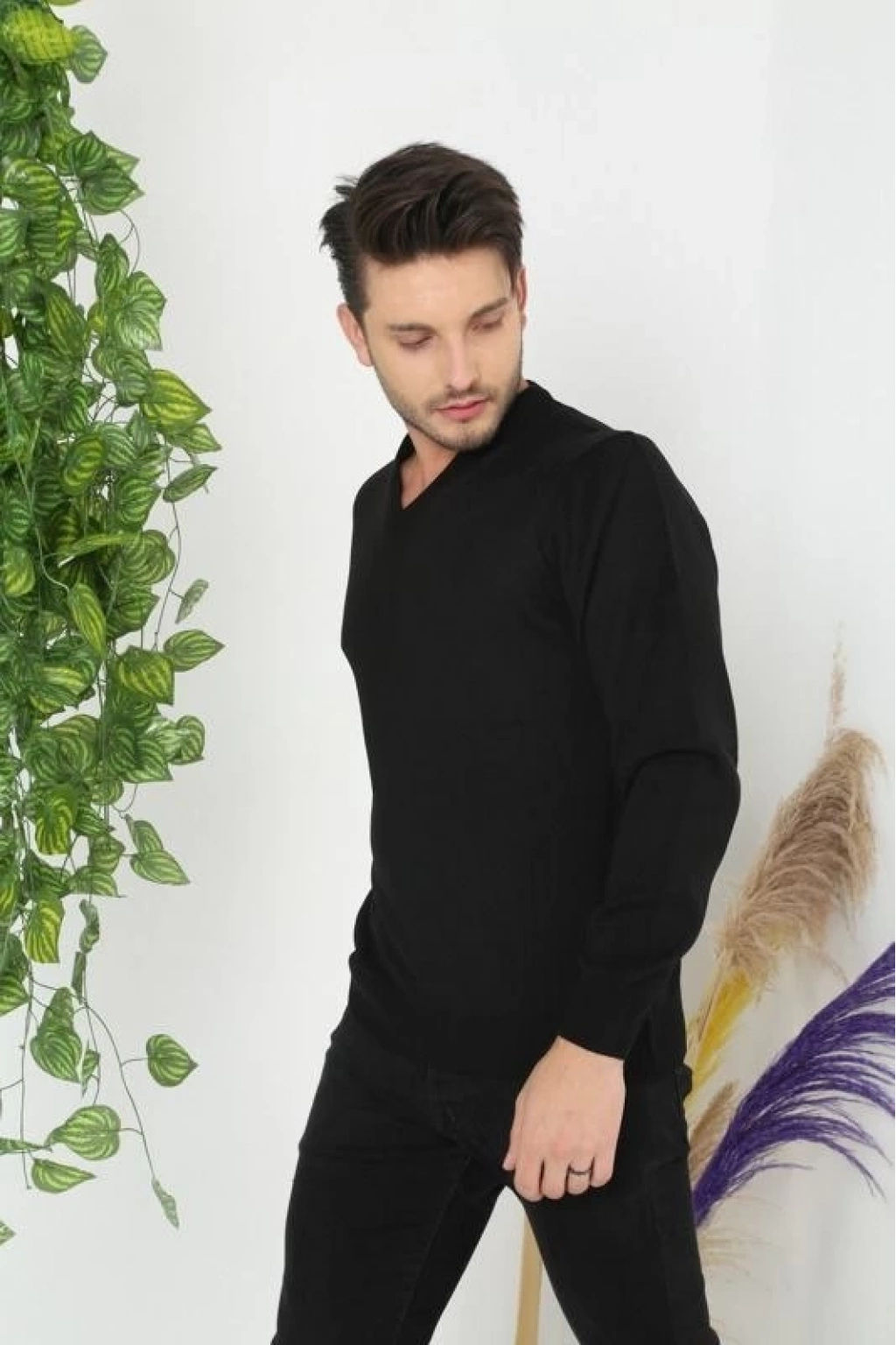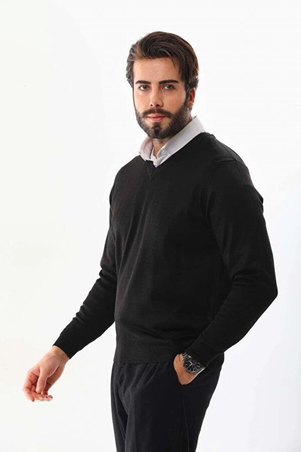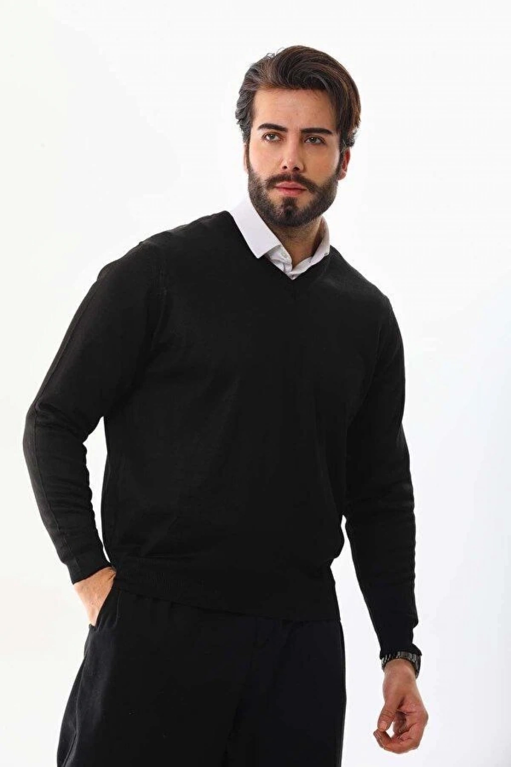 Uzun Kol V Yaka Triko Kazak - Siyah